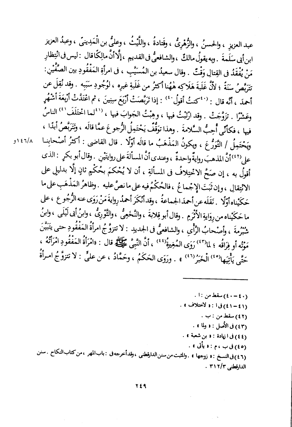 عبد العزيزِ، والحسنُ، والزُّهْرِىُّ، وقَتادةُ، واللَّيْثُ، وعلىُّ بن الْمَدِينىّ، وعبدُ العزيز ابن أبي سَلَمةَ. وبه يقولُ مالكٌ، والشافعىُّ فى القديمِ، إلَّا أنَّ مالِكًا قال: ليس فى انْتِظارِ مَنْ يُفْقَدُ فى القِتالِ وَقْتٌ. وقال سعيدُ بن المُسَيَّبِ، فى امرأةِ المَفْقُودِ بين الصَّفَّيْنِ: تتَرَبَّصُ سَنَةً؛ لأنَّ غَلَبةَ هَلَاكِه ههُنا أكثرُ من غَلَبةِ غيرِه، لوُجُودِ سَبَبِه. وقد نُقِلَ عن أحمدَ، أنَّه قال: [كنتُ أقولُ] (٤٠): إذا تَرَبَّصَتْ أَرْبَعَ سِنِينَ، ثم اعْتَدَّتْ أرْبعَةَ أشْهُرٍ وعَشْرًا. تزَوَّجَتْ. وقد ارْتَبْتُ فيها، وهِبْتُ الجَوابَ فيها، [لما اخْتَلَفَ] (٤١) الناسُ فيها، فكأنِّي أُحِبُّ السَّلامةَ. وهذا توَقُّفٌ يَحْتَمِلُ الرُّجوعَ عمَّا قالَه، وَتَتَرَبَّصُ أبدًا، ويَحْتَمِلُ التَّوَرُّعَ، ويكونُ المَذْهَبُ ما قالَه أوّلًا. قال القاضى: أكثرُ أصْحابِنا على (٤٢) أنَّ المذهبَ روايةٌ واحدةٌ، وعندى أنَّ المسألةَ على روايتَيْنِ. وقال أبو بكرٍ: الذى أقولُ به، إن صَحَّ الاخْتِلافُ فى المسألةِ، أن لا يُحْكمَ بحُكْمٍ ثانٍ إلَّا بدليلٍ على الانْتِقالِ، وإنْ ثَبَتَ الإِجْماعُ، فالحُكْمُ فيه على ما نصَّ عليه. وظاهرُ المَذْهَبِ على ما حَكَيْناه أوّلًا. نَقَلَه عن أحمدَ الجماعةُ، وقد أنْكَرَ أحمدُ رِوايةَ مَنْ رَوَى عنه الرُّجُوع، على ما حَكَيْناه من رِوَايةِ الأثْرَمِ. وقال أبو قِلابةَ، والنَّخَعِىُّ، والثَّوْرِىُّ، وابنُ أبي لَيْلَى، وابنُ شُبْرُمةَ، وأصْحابُ الرَّأْىِ، والشافعىُّ فى الجديدِ: لا تتزوَّجُ امرأةُ المَفْقُودِ حتَّى يَتَبَيَّنَ مَوْتُه أو فِرَاقُه؛ لما (٤٣) رَوَى المُغِيرةُ (٤٤)، أنَّ النَّبِىَّ -صلى اللَّه عليه وسلم- قال: "امْرَأةُ المَفْقُودِ امْرَأتُهُ، حَتَّى يَأْتِيَها (٤٥) الْخَبَرُ (٤٦) ". ورَوَى الحَكَمُ، وحَمَّادُ، عن عليٍّ: لا تتزوَّجُ امرأةُ