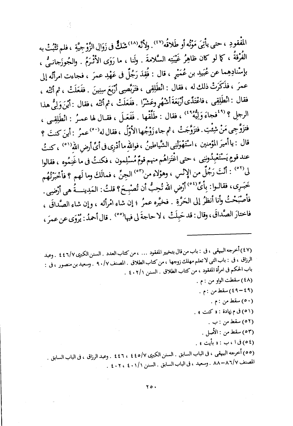 (٤٧) أخرجه البيهقى، فى: باب من قال بتخيير المفقود. . .، من كتاب العدد. السنن الكبرى ٧/ ٤٤٦. وعبد الرزاق، فى: باب التى لا تعلم مهلك زوجها، من كتاب الطلاق. المصنف ٧/ ٩٠. وسعيد بن منصور، فى: باب الحكم فى امرأة المفقود، من كتاب الطلاق. السنن ١/ ٤٠٢.