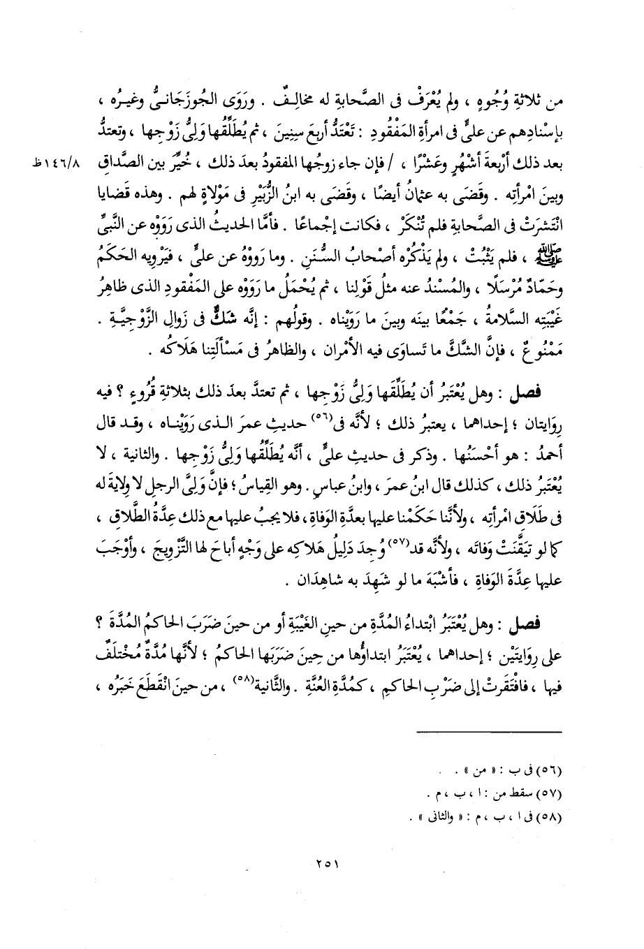 من ثلاثةِ وُجُوهٍ، ولم يُعْرَفْ فى الصَّحابةِ له مخالِفٌ. ورَوَى الجُوزَجَانىُّ وغيرُه، بإسْنادِهم عن عليٍّ فى امرأةِ المَفْقُودِ: تَعْتَدُّ أربعَ سِنِينَ، ثم يُطَلِّقُها وَلِىُّ زَوْجِها، وتعتدُّ بعد ذلك أربعةَ أشْهُرٍ وعَشْرًا، فإن جاء زوجُها المفقودُ بعدَ ذلك، خُيِّرَ بين الصَّداقِ وبينَ امْرأتِه. وقَضَى به عثمانُ أيضًا، وقَضَى به ابنُ الزُّبَيْرِ فى مَوْلاةٍ لهم. وهذه قَضايا انْتَشرَتْ فى الصَّحابةِ فلم تُنْكَرْ، فكانت إجْماعًا. فأمَّا الحديثُ الذى رَوَوْه عن النَّبىِّ -صلى اللَّه عليه وسلم-، فلم يَثْبُتْ، ولم يَذْكُرْه أصْحابُ السُّنَنِ. وما رَووْهُ عن عليٍّ، فيَرْوِيه الحَكَمُ وحَمَّادٌ مُرْسَلًا، والمُسْندُ عنه مثلُ قَوْلِنا، ثم يُحْمَلُ ما رَوَوْه على المَفْقودِ الذى ظاهِرُ غَيْبَتِه السَّلامةُ، جَمْعًا بينَه وبينَ ما رَوَيْناه. وقولُهم: إنَّه شَكٌّ فى زَوالِ الزَّوْجِيَّةِ. مَمْنُوعٌ، فإنَّ الشَّكَّ ما تَساوَى فيه الأمْران، والظاهرُ فى مَسْألَتِنا هَلَاكُه.