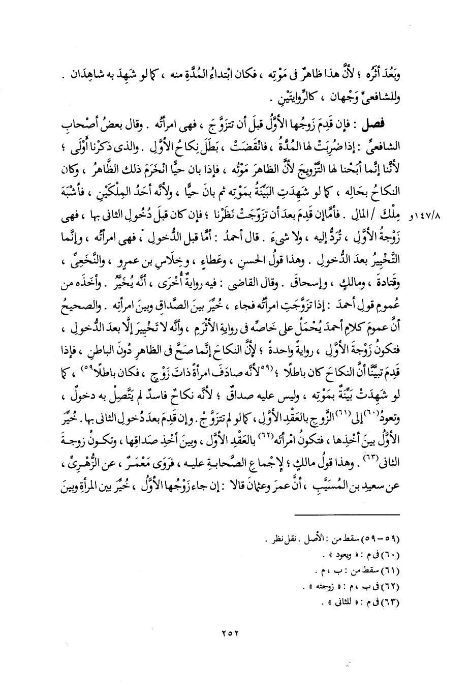 فصل: فإن قَدِمَ زَوجُها الأوَّلُ قبلَ أن تتزَوَّجَ، فهى امرأتُه. وقال بعضُ أصْحابِ الشافعىِّ: إذا ضُرِبَتْ لها المُدَّةُ، فانْقَضَتْ، بَطلَ نِكاحُ الأوَّلِ. والذى ذكرْنا أَوْلَى؛ لأنَّنا إنَّما أَبَحْنا لها التَّزْويجَ لأنَّ الظاهرَ مَوْتُه، فإذا بان حيًّا انْخَرَمَ ذلك الظَّاهرُ، وكان النكاحُ بحَالِه، كما لو شَهِدَتِ البَيِّنَةُ بمَوْتِه ثم بانَ حيًّا، ولأنَّه أحَدُ المِلْكَيْنِ، فأشْبَهَ مِلْكَ المالِ. فأمَّا إن قَدِمَ بعدَ أن تزَوّجَتْ نَظَرْنا؛ فإن كان قبلَ دُخُولِ الثاني بها، فهى زَوْجةُ الأوَّلِ، تُرَدُّ إليه، ولا شىءَ. قال أحمدُ: أمَّا قبل الدُّخولِ، فهى امرأتُه، وإنَّما التَّخْيِيرُ بعدَ الدُّخولِ. وهذا قولُ الحسنِ، وعَطاءٍ، وخِلَاسِ بن عمرٍو، والنَّخَعِىِّ، وقَتادةَ، ومالكٍ، وإسحاقَ. وقال القاضى: فيه روايةٌ أُخْرَى، أنَّه يُخَيَّرُ. وأخَذَه من عُمومِ قولِ أحمدَ: إذا تزَوَّجَتِ امرأتُه فجاء، خُيِّرَ بينَ الصَّداقِ وبينَ امرأتِه. والصحيحُ أنَّ عمومَ كلامِ أحمدَ يُحْمَلُ على خَاصِّه فى روايةِ الأثْرَمِ، وأنَّه لا تَخْيِيرَ إلَّا بعدَ الدُّخولِ، فتكونُ زَوْجةَ الأوَّلِ، روايةً واحدةً؛ لأنَّ النكاحَ إنَّما صَحَّ فى الظاهرِ دُونَ الباطنِ، فإذا قَدِمَ تبيَّنَّا أنَّ النكاحَ كان باطلًا؛ [لأنَّه صادَفَ امرأةً ذاتَ زَوْجٍ، فكان باطلًا] (٥٩)، كما لو شَهِدَتْ بَيِّنَةٌ بمَوْتِه، وليس عليه صداقٌ؛ لأنَّه نكاحٌ فاسدٌ لم يَتَّصِلْ به دخولٌ، وتعودُ (٦٠) إلى (٦١) الزَّوجِ بالعَقْدِ الأوَّلِ، كما لو لم تتزَوَّجْ. وإن قَدِمَ بعدَ دُخولِ الثاني بها. خُيِّرَ الأوَّلُ بينَ أخْذِها، فتكونُ امْرأتَه (٦٢) بالعَقْدِ الأوَّل، وبينَ أخْذِ صَداقِها، وتكونُ زوجةَ الثاني (٦٣). وهذا قولُ مالكٍ؛ لإِجْماعِ الصَّحابةِ عليه، فرَوَى مَعْمَرٌ، عن الزُّهْرِيِّ، عن سعيدِ بن المُسَيَّبِ، أنَّ عمرَ وعثمانَ قالا: إن جاء زَوْجُها الأوَّلُ، خُيِّرَ بين المرأةِ وبينَ