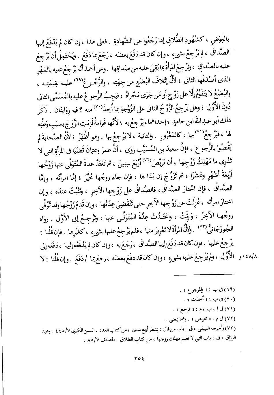 بالعِوَضِ، كشُهُودِ الطَّلاقِ إذا رَجَعُوا عن الشَّهادةِ. فعلى هذا، إن كان لم يَدْفَعْ إليها الصَّداقَ، لم يَرْجِعْ بشىءٍ، وإن كان قد دَفَعَ بعضَه، رَجَعَ بما دَفَعَ. ويَحْتَمِلُ أن يَرْجِعَ عليه بالصَّداقِ، وتَرْجِعَ المرأةُ بما بَقِىَ عليه من صَداقِها. وعن أحمدَ أَنَّه يَرْجِعُ عليه بالمَهْرِ الذى أصْدَقَها الثانى؛ لأنَّ إتْلافَ البُضْعِ من جِهَتِه، والرُّجُوعُ (٦٩) عليه بقِيمَتِه، والبُضْعُ لا يتَقَوَّمُ إلَّا على زَوْجٍ أو مَن جَرَى مَجْراهُ، فيَجِبُ الرُّجوعُ عليه بالمُسَمَّى الثانى دُونَ الأوَّلِ؛ وهل يَرْجِعُ الزَّوْجُ الثانى على الزَّوْجةِ بما أُخِذَ (٧٠) منه؟ فيه رِوَايتَان. ذَكَر ذلك أبو عبدِ اللَّه ابن حامدٍ؛ إحداهما، يَرْجِعُ به؛ لأنَّها غَرامةٌ لَزِمَتِ الزَّوْجَ بسبَبِ وَطْئِه لها، فيَرْجِعُ (٧١) بها، كالمَغْرُورِ. والثانية، لا يَرْجِعُ بها. وهو أظْهَرُ؛ لأنَّ الصَّحابةَ لم يَقْضُوا بالرُّجوع، فإنَّ سعيدَ بن المُسَيَّبِ روَى، أنَّ عمرَ وعثمانَ قَضَيَا فى المرأةِ التى لا تَدْرِى ما مَهْلِكُ زَوْجِها، أن تَرَبَّصَ (٧٢) أَرْبَعَ سِنِينَ، ثم تَعْتَدَّ عدةَ المُتَوَفَّى عنها زَوْجُها أرْبعَةَ أشْهُرٍ وعَشْرًا، ثم تَزَوَّجَ إن بَدَا لها، فإن جاء زوجُها خُيِّرَ؛ إمَّا امرأتُه، وإمَّا الصَّداقُ، فإن اخْتارَ الصَّداقَ، فالصَّداقُ على زَوْجِهِا الآخِرِ، وَتْثْبُتُ عندَه، وإن اختارَ امرأتَه، عُزِلَتْ عن زَوْجِها الآخِرِ حتى تَنْقَضِىَ عِدّتُها، وإن قَدِمَ زَوْجُها وقد تُوُفِّى زوجُها الآخِرُ، وَرِثَتْ، واعْتَدَّتْ عِدَّةَ المُتَوَفَّى عنها، وتَرْجِعُ إلى الأوَّلِ. روَاه الجُوزَجَانىُّ (٧٣). ولأنَّ المرأةَ لا تَغْرِيرَ منها، فلم يَرْجِعْ عليها بشىءٍ، كغَيْرِها. فإن قُلْنا: يرْجِعُ عليها. فإن كان قد دَفَعَ إليها الصَّداقَ، رَجَعَ به، وإن كان لم يَدْفَعْه إليها، دَفَعَه إلى الأوَّلِ، ولم يَرْجِعْ عليها بشىءٍ، وإن كان قد دفَعَ بعضَه، رجعَ بما دَفَعَ. وإن قُلْنا: لا
