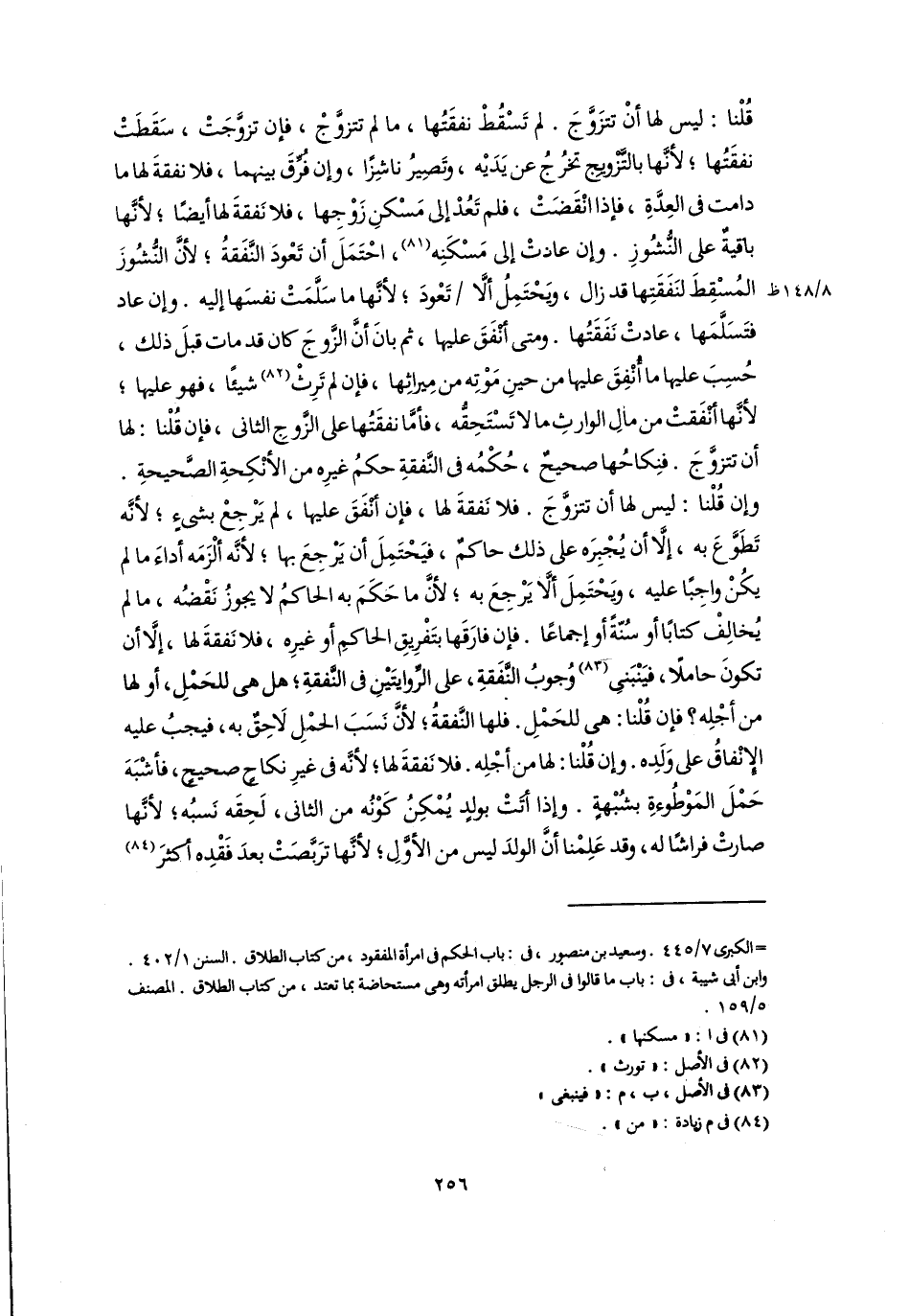 قُلْنا: ليس لها أنْ تتزَوَّجَ. لم تَسْقُطْ نفقَتُها، ما لم تتزوَّجْ، فإن تزوَّجَتْ، سَقَطَتْ نفقَتُها؛ لأنَّها بالتَّزويجِ تخرُجُ عن يَدَيْه، وتَصِيرُ ناشِزًا، وإن فُرِّقَ بينهما، فلا نفقةَ لها ما دامت في العِدَّةِ، فإذا انْقَضَتْ، فلم تَعُدْ إلى مَسْكنِ زَوْجِها، فلا نَفقةَ لها أيضًا؛ لأنَّها باقيةٌ على النُّشُوزِ. وإن عادتْ إلى مَسْكَنِه (٨١)، احْتَمَلَ أن تَعْودَ النَّفَقةُ؛ لأنَّ النُّشُوزَ المُسْقِطَ لنَفَقَتِها قد زال، ويَحْتَمِلُ ألَّا تَعْودَ؛ لأنَّها ما سَلَّمَتْ نفسَها إليه. وإن عاد فتَسَلَّمَها، عادتْ نَفَقَتُها. ومتى أَنْفَقَ عليها، ثم بانَ أنَّ الزَّوجَ كان قد مات قبلَ ذلك، حُسِبَ عليها ما أُنْفِقَ عليها من حينِ مَوْتِه من مِيراثِها، فإن لم تَرِثْ (٨٢) شيئًا، فهو عليها؛ لأنَّها أَنْفَقتْ من مالِ الوارثِ ما لا تَسْتَحِقُّه، فأمَّا نفقَتُها على الزَّوجِ الثانى، فإن قُلْنا: لها أن تتزوَّجَ. فنِكاحُها صحيحٌ، حُكْمُه فى النَّفقةِ حكمُ غيرِه من الأنْكِحةِ الصَّحيحةِ. وإن قُلْنا: ليس لها أن تتزوَّجَ. فلا نَفقةَ لها، فإن أنْفَقَ عليها، لم يَرْجِعْ بشىءٍ؛ لأنَّه تَطَوَّعَ به، إلَّا أن يُجْبِرَه على ذلك حاكمٌ، فيَحْتَمِلَ أن يَرْجِعَ بها؛ لأنَّه ألْزَمَه أداءَ ما لم يكُنْ واجِبًا عليه، ويَحْتَمِلَ ألَّا يَرْجِعَ به؛ لأنَّ ما حَكَمَ به الحاكِمُ لا يجوزُ نَقْضُه، ما لم يُخالِفْ كتابًا أو سُنّةً أو إجماعًا. فإن فارَقَها بتَفْرِيقِ الحاكمِ أو غيرِه، فلا نَفقةَ لها، إلَّا أن تكونَ حاملًا، فيَنْبَنِى (٨٣) وُجوبُ النَّفَقةِ، على الرِّوايتَيْنِ فى النَّفقةِ؛ هل هى للحَمْلِ، أو لها من أجْلِه؟ فإن قُلْنا: هى للحَمْلِ. فلها النَّفقةُ؛ لأنَّ نَسَبَ الحمْل لَاحِقٌ به، فيجبُ عليه الإِنْفاقُ على وَلَدِه. وإن قُلْنا: لها من أجْلِه. فلا نَفقةَ لها؛ لأنَّه فى غيرِ نكاحٍ صحيحٍ، فأشْبَهَ حَمْلَ المَوْطُوءةِ بشُبْهةٍ. وإذا أَتَتْ بولدٍ يُمْكِنُ كَوْنُه من الثانى، لَحِقَه نَسبُه؛ لأنَّها صارتْ فراشًا له، وقد عَلِمْنا أنَّ الولدَ ليس من الأوَّلِ؛ لأنَّها ترَبَّصَتْ بعدَ فَقْدِه أكثرَ (٨٤)