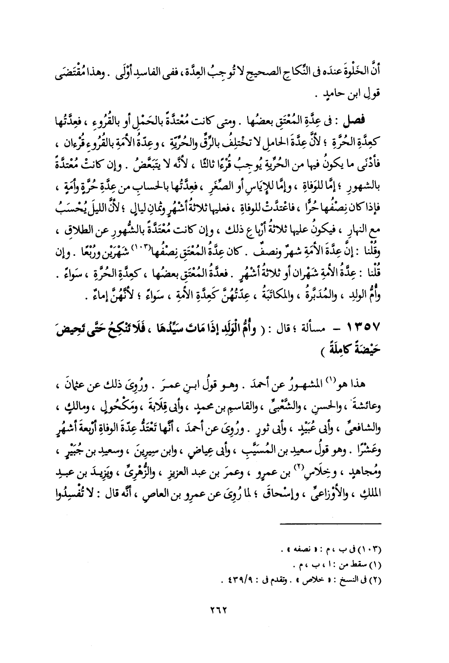 فصل: فى عِدَّةِ المُعْتَقِ بعضُها. ومتى كانت مُعْتدَّةً بالحَمْلِ أو بالقُرُوءِ، فعِدَّتُها كعِدَّةِ الحُرَّةِ؛ لأنَّ عِدَّةَ الحاملِ لا تخْتلِفُ بالرِّقِّ والحُرِّيَّةِ، وعِدّةُ الأمَةِ بالقُرُوءِ قُرْءان، فأدْنَى ما يكونُ فيها من الحُرِّيةِ يُوجِبُ قُرْءًا ثالثًا، لأنَّه لا يتَبَعَّضُ. وإن كانتْ مُعْتدَّةً بالشهورِ؛ إِمَّا للوَفاةِ، وإمَّا للإِيَاسِ أو الصِّغَرِ، فعِدَّتُها بالحسابِ من عِدَّةِ حُرَّةٍ وأمَةٍ، فإذا كان نِصْفُها حُرًّا، فاعْتدَّتْ للوفاةِ، فعليها ثلاثةُ أشْهُرٍ وثمانِ ليالٍ؛ لأنَّ الليلَ يُحْسَبُ مع النهارِ، فيكونُ عليها ثلاثةُ أرْبَاعِ ذلك، وإن كانت مُعْتَدَّةً بالشُّهورِ عن الطلاقِ، وقُلْنا: إنَّ عِدَّةَ الأمَةِ شهرٌ ونصفٌ. كان عِدَّةُ المُعْتَقِ نِصْفُها (١٠٣) شَهْرَيْن ورُبْعًا. وإن قُلْنا: عِدَّةُ الأمةِ شَهْران أو ثلاثةُ أشْهُرٍ. فعدَّةُ المُعْتَقِ بعضُها، كعِدَّةِ الحُرَّةِ، سَواءً. وأُمُّ الولدِ، والمُدَبَّرةُ، والمكاتَبَةُ، عِدّتُهُنَّ كَعِدَّةِ الأمةِ، سَواءً؛ لأنَّهُنَّ إماءٌ.