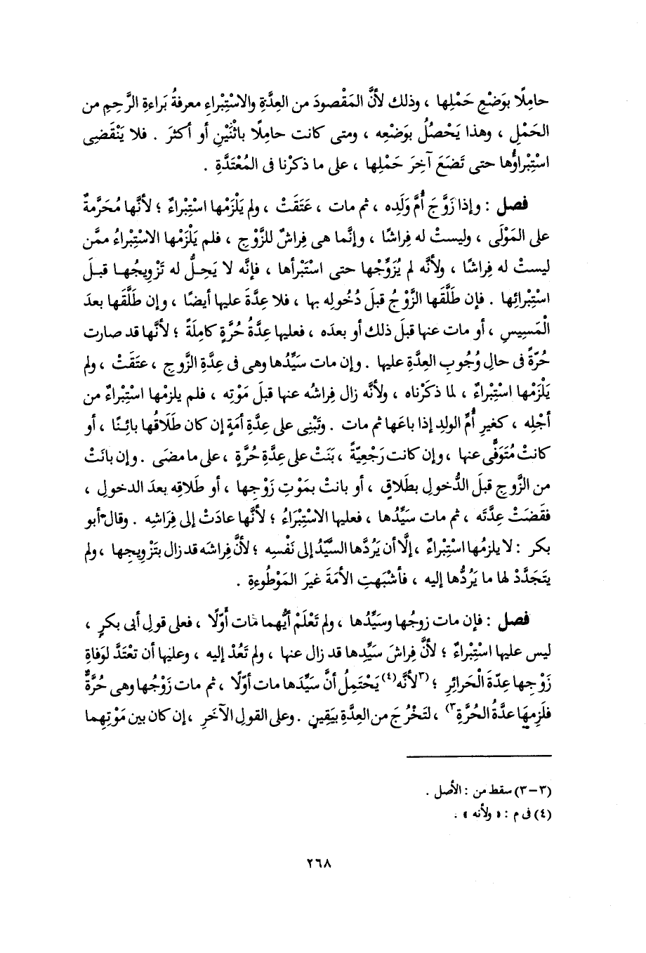 فصل: وإذا زَوَّجَ أُمَّ وَلَدِه، ثم مات، عَتَقَتْ، ولم يَلْزَمْها اسْتِبْراءٌ؛ لأنَّها مُحَرَّمةٌ على المَوْلَى، وليستْ له فِراشًا، وإنَّما هي فِراشٌ للزَّوْجِ، فلم يَلْزَمْها الاسْتِبْراءُ ممَّن ليستْ له فِراشًا، ولأنَّه لم يُزَوِّجْها حتى اسْتَبْرأها، فإنَّه لا يَحِلُّ له تَزْوِيجُها قبلَ اسْتِبْرائِها. فإنَّ طَلَّقَها الزَّوْجُ قبلَ دُخُولِه بها، فلا عِدَّةَ عليها أيضًا، وإن طَلَّقَها بعدَ الْمَسِيسِ، أو مات عنها قبلَ ذلك أو بعدَه، فعليها عِدَّةُ حُرَّةٍ كامِلَةً؛ لأنَّها قد صارت حُرّةً في حالِ وُجُوبِ العِدَّةِ عليها. وإن مات سَيِّدُها وهى في عِدَّةِ الزَّوجِ، عتَقَتْ، ولم يَلْزَمْها اسْتِبْراءٌ، لما ذكَرْناه، ولأنَّه زال فِراشُه عنها قبلَ مَوْتِه، فلم يلزمْها اسْتِبْراءٌ من أجْلِه، كغيرِ أُمِّ الولدِ إذا باعَها ثم مات. وَتَبْنِى على عِدَّةِ أمَةٍ إن كان طَلَاقُها بائِنًا، أو كانتْ مُتَوَفَّى عنها، وإن كانت رَجْعِيّةً، بَنَتْ على عِدَّةِ حُرَّةٍ، على ما مضَى. وإن بانَتْ من الزَّوجِ قبلَ الدُّخولِ بطَلاقٍ، أو بانتْ بمَوْتِ زَوْجها، أو طَلاقِه بعدَ الدخولِ، فقَضَتْ عِدَّتَه، ثم مات سَيِّدُها، فعليها الاسْتِبْرَاءُ؛ لأنَّها عادَتْ إلى فِرَاشِه. وقال أبو بكر: لا يلزمُها اسْتِبْراءٌ، إلَّا أن يَرُدَّها السَّيِّدُ إلى نَفْسِه؛ لأنَّ فِراشَه قد زال بتَزْوِيجِها، ولم يتَجَدَّدْ لها ما يَرُدُّها إليه، فأشْبَهتِ الأمَةَ غيرَ المَوْطُوءةِ.