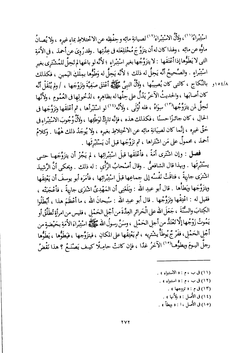 اسْتِبْراءً (١١)، ولأنَّ الاسْتِبْراءَ (١٢) لصيانةِ مائِه وحِفْظِه عن الاخْتلاطِ بماءِ غيرِه، ولا يُصانُ ماؤُه عن مائِه، ولهذا كان له أن يتزَوَّجَ مُخْتَلِعَتَه في عِدَّتِها. وقد رُوِىَ عن أحمدَ، في الأمَةِ التي لا يَطَؤُها إذا أعْتَقَها: لا يتزَوَّجُها بغيرِ اسْتِبْراءٍ؛ لأنَّه لو باعَها لم تَحِلَّ للمُشْتَرِى بغيرِ اسْتِبْراءٍ. والصَّحيحُ أنَّه يَحِلُّ له ذلك؛ لأنَّه يَحِلُّ له وَطْؤُها بمِلْكِ اليَمينِ، فكذلك بالنِّكاحِ، كالتى كان يُصِيبُها، ولأنَّ النبِىَّ -صلى اللَّه عليه وسلم- أعْتَقَ صَفِيَّةَ وَتَزَوَّجَها، ولم يُنْقَلْ أنَّه كان أصابَها، والحديثُ الآخرُ يَدُلُّ على حِلِّها له بظاهِرِه، لدُخُولِها في العُمُومِ، ولأنَّها تَحِلُّ لمن يتزَوَّجُها (١٣) سِوَاهُ، فله أَوْلَى، ولأنَّه (١٤) لو اسْتَبْرأها، ثم أعْتَقَها وَتَزَوَّجَها في الحالِ، كان جائزًا حسنًا، فكذلك هذه، فإنَّه تارِكٌ لوَطْئِها، ولأنَّ وُجُوبَ الاسْتِبْراءِ في حَقِّ غيرِه، إنَّما كان لصِيَانةِ مائِه عن الاخْتِلاطِ بغيرِه، ولا يُوجَدُ ذلك ههُنا. وكلامُ أحمدَ، محمولٌ على مَن اشْتَراها، ثم تزَوَّجَها قبل أن يَسْتَبْرِئَها.