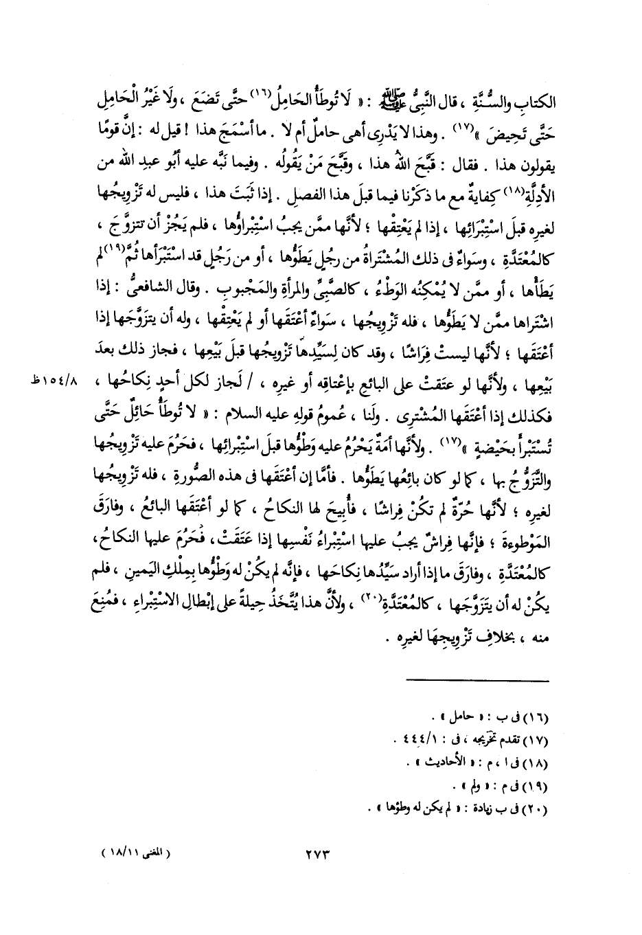 الكتابِ والسُّنَّةِ، قال النَّبِىُّ -صلى اللَّه عليه وسلم-: "لَا تُوطَأُ الحَامِلُ (١٦) حتَّى تَضَعَ، ولَا غَيْرُ الْحَامِلِ حَتَّى تَحِيضَ" (١٧). وهذا لا يَدْرِى أهى حاملٌ أم لا. ما أسْمَجَ هذا! قيل له: إنَّ قَومًا يقولون هذا. فقال: قَبَّحَ اللهُ هذا، وقَبَّحَ مَنْ يَقُولُه. وفيما نَبَّه عليه أبُو عبدِ اللَّه من الأدِلَّةِ (١٨) كِفايةٌ مع ما ذكَرْنا فيما قبلَ هذا الفصلِ. إذا ثَبَتَ هذا، فليس له تَزْوِيجُها لغيرِه قبلَ اسْتِبْرَائِها، إذا لم يَعْتِقْها؛ لأنَّها ممَّن يجبُ اسْتِبْراؤُها، فلم يَجُزْ أن تتزوَّجَ، كالمُعْتَدَّةِ، وسَواءٌ في ذلك المُشْتَراةُ من رجُلٍ يَطَؤُها، أو من رَجُلٍ قد اسْتَبْرَأها ثُمَّ (١٩) لم يَطَأْها، أو ممَّن لا يُمْكِنُه الوَطْءُ، كالصَّبِىِّ والمرأةِ والمَجْبوبِ. وقال الشافعيُّ: إذا اشْتَراها ممَّن لا يَطَؤُها، فله تَزْوِيجُها، سَواءٌ أعْتَقَها أو لم يَعْتِقْها، وله أن يتزَوَّجَها إذا أعْتَقَها؛ لأنَّها ليستْ فِرَاشًا، وقد كان لِسَيِّدِها تَزْويجُها قبلَ بَيْعِها، فجاز ذلك بعدَ بَيْعِها، ولأنَّها لو عتَقتْ على البائعِ بإعْتاقِه أو غيرِه، لَجاز لكل أحدٍ نِكاحُها، فكذلك إذا أعْتَقَها المُشْترِى. ولَنا، عُمومُ قولهِ عليه السلام: "لا تُوطَأُ حَائِلٌ حَتَّى تُسْتَبْرَأَ بحَيْضةٍ" (١٧). ولأنَّها أمَةٌ يَحْرُمُ عليه وَطْؤُها قبلَ اسْتِبْرائِها، فحَرُمَ عليه تَزْوِيجُها والتَّزَوُّجُ بها، كما لو كان بائِعُها يَطَؤُها. فأمَّا إن أعْتَقَها في هذه الصُّورةِ، فله تَزْوِيجُها لغيرِه؛ لأنَّها حُرّةٌ لم تكُنْ فِراشًا، فأُبِيحَ لها النِّكاحُ، كما لو أعْتَقَها البائعُ، وفارَقَ المَوْطوءةَ؛ فإنَّها فِراشٌ يجبُ عليها اسْتِبْراءُ نَفْسِها إذا عَتَقَتْ، فحَرُمَ عليها النكاحُ، كالمُعْتَدَّةِ، وفارَقَ ما إذا أراد سَيِّدُها نِكاحَها، فإنَّه لم يكُنْ له وَطْؤُها يمِلْكِ اليَمينِ، فلم يكُنْ له أن يتَزَوَّجَها، كالمُعْتَدَّةِ (٢٠)، ولأنَّ هذا يُتَّخَذُ حِيلةً على إبْطالِ الاسْتِبْراءِ، فمُنِعَ منه، بخلافِ تَزْوِيجِهَا لغيرِه.
