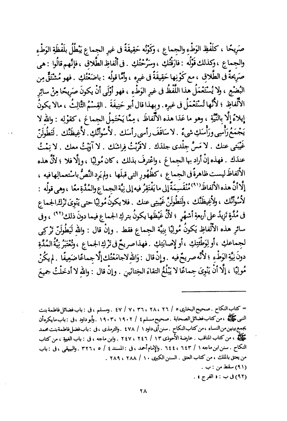 صَرِيحًا، كلَفْظِ الوَطْءِ والجِماعِ، وكَوْنُه حَقِيقَةً فى غيرِ الجِماعِ يَبْطُلُ بلَفْظَةِ الوَطْءِ والجِماعِ، وكذلك قَوْلُه: فارَقْتُكِ، وسَرَّحْتُكِ. فى ألْفاظِ الطَّلاقِ، فإنَّهم قالُوا: هى صَرِيحةٌ فى الطَّلاقِ، مع كَوْنِها حَقِيقَةً فى غيرِه، وأمَّا قولُه: باضَعْتُكِ. فهو مُشْتَقٌّ مِن البُضْعِ، ولا يُسْتَعْمَلُ هذا اللَّفْظُ فى غيرِ الوَطْءِ، فهو أوْلَى أَنْ يكونَ صَرِيحًا مِنْ سائِرِ الأَلْفاظِ؛ لأَنَّها تُسْتَعْمَلُ فى غيرِه. وبهذا قال أبو حَنِيفَةَ. القِسْمُ الثَّالِثُ، ما لا يكونُ إِيلاءً إِلَّا بِالنِّيَّةِ، وهو ما عَدَا هذه الأَلْفاظَ، مِمَّا يَحْتَمِلُ الجماعَ، كقوْلِه: واللَّهِ لا يَجْمَعُ رَأْسِى ورَأْسَكِ شىءٌ. لا سَاقَفَ رأسى رأسَك. لأَسُوأنَّكِ. لأَغِيظَنَّك. لَتَطُولَنّ غَيْبَتى عنك. لا مَسَّ جِلْدى جلدَك. لا قَرُبْتُ فِراشَك. لا آوَيْتُ معك. لا نِمْتُ عندَك. فهذه إنْ أراد بها الجِماعَ، واعْترفَ بذلك، كان مُولِيًا، وإلَّا فلا؛ لأنَّ هذه الألفاظَ ليست ظاهرةً فى الجِماعِ، كظُهُورِ التى قبلَها، ولم يَرِد النَّصُّ باسْتعمالِها فيه، إلَّا أَنَّ هذه الألفاظَ (٩١) مُنْقَسِمَةٌ إلى ما يَفْتَقِرُ فيه إلى نِيَّة الجِماعِ والمُدَّةِ معًا، وهى قولُه: لأسُوأنَّك، ولأغِيظَنَّك، ولَتَطُولَنَّ غَيْبتِى عنك. فلا يكونُ مُولِيًا حتى يَنْوِىَ تَرْكَ الجماعِ فى مُدَّةٍ تَزِيدُ على أربعةِ أشهُرٍ؛ لأنَّ غَيْظَها يكونُ بتركِ الجماعِ فيما دونَ ذلك (٩٢)، وفى سائرِ هذه الألْفاظِ يَكونُ مُولِيًا بِنِيَّة الجِماعِ فقط. وإِنْ قال: واللَّهِ لَيَطُولَنّ تَرْكِى لجِماعكِ، أو لِوَطْئَتِكِ، أو لإِصابَتِكِ. فهذا صريحٌ فى تَرْكِ الجماعِ، وتُعْتَبَرُ نِيَّةُ المُدَّةِ دونَ نِيَّةِ الوَطْءِ؛ لأَنَّه صريحٌ فيه. وإِنْ قال: وَاللَّهِ لا جامَعْتُك إلَّا جِماعًا ضَعِيفًا. لم يكُنْ مُولِيًا، إلَّا أَنْ يَنْوِىَ جِماعًا لا يَبْلُغُ التقاءَ الخِتانَينِ. وإِنْ قال: واللَّهِ لا أدخَلْتُ جميعَ