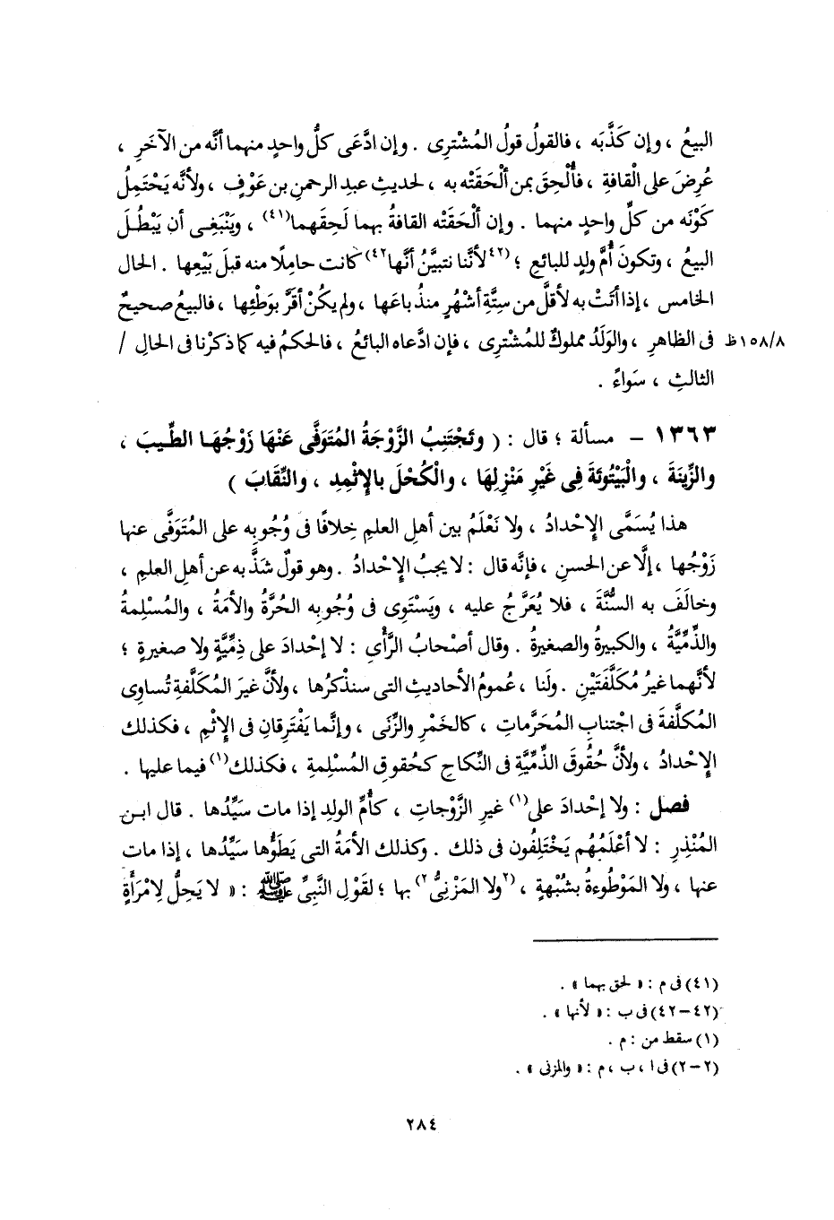 ١٣٦٣ - مسألة؛ قال: (وتَجْتَنِبُ الزَّوْجَةُ المُتَوَفَّى عَنْهَا زَوْجُهَا الطِّيبَ، والزِّينَةَ، والْبَيْتُوتَةَ فِي غَيْرِ مَنْزِلِهَا، والْكُحْلَ بالإِثْمِدِ، والنِّقَابَ)