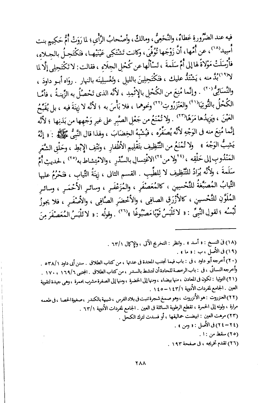 فيه عند الضَّرُورةِ عَطاءٌ، والنَّخَعِيُّ، ومالكٌ، وأصْحابُ الرَّأْىِ؛ لما رَوَتْ أُمُّ حَكِيمٍ بنت أَسِيد (١٨)، عن أُمِّها، أنَّ زَوْجَها تُوُفِّىَ، وكانت تَشْتَكِى عَيْنَيْها، فتَكْتَحِلُ بالجِلاءِ، فأَرْسَلَتْ مَوْلاةً لها إلى أُمِّ سَلَمةَ، تَسْألُها عن كُحْلِ الجِلَاءِ، فقالت: لا تَكْتَحِلِى إلَّا لما لا (١٩) بُدَّ منه، يَشْتَدُّ عليك، فتَكْتَحِلِينَ بالليلِ، وتَغْسِلِينَه بالنهار. روَاه أبو داودَ، والنَّسَائِيُّ (٢٠). وإنَّما مُنِعَ من الكُحْلِ بالإِثْمِدِ، لأنَّه الذي تَحْصُلُ به الزِّينةُ، فأمَّا الكُحْلُ بالتُّوتِيَا (٢١) والعَنْزَرُوتِ (٢٢) ونحوهما، فلا بَأْسَ به؛ لأنَّه لا زِينَةَ فيه، بل يُقَبِّحُ العَيْنَ، ويَزِيدُها مَرَهًا (٢٣). ولا تُمْنَعُ من جَعْلِ الصَّبِرِ على غيرِ وَجْهِها من بَدَنِها؛ لأنَّه إنَّما مُنِعَ منه في الوَجْهِ لأنَّه يُصَفِّرُه، فيُشْبِهُ الخِضَابَ، ولهذا قال النَّبِيُّ -صلى اللَّه عليه وسلم-: "إنَّهُ يَشِبُّ الوَجْهَ" ولا تُمْنَعُ من التَّنْظِيفِ بتَقْلِيمِ الأظْفارِ، ونَتْفِ الإِبْطِ، وحَلْقِ الشَّعَرِ المَنْدُوبِ إلى حَلْقِه، [ولا من] (٢٤) الاغْتِسالِ بالسِّدْرِ، والامْتِشاط به (٢٥)، لحديثِ أُمِّ سَلَمةَ، ولأنَّه يُرَادُ للتَّنْظِيفِ لا لِلطِّيبِ. القسم الثاني، زِينَةُ الثِّيابِ، فتَحْرُمُ عليها الثِّيابُ المُصَبَّغةُ للتَّحْسِينِ، كالمُعَصْفَرِ، والمُزَعْفَرِ، وسائرِ الأحْمَرِ، وسائرِ المُلَوَّنِ للتَّحْسينِ، كالأزْرَقِ الصافِى، والأخْضَرِ الصَّافِى، والأصْفَرِ، فلا يجوزُ لُبْسُه؛ لقولِ النَّبِيِّ: "لا تَلْبَسُ ثَوْبًا مَصْبُوغًا" (٢٦). وقولُه: "لا تَلْبَسُ المُعَصْفَرَ مِنَ