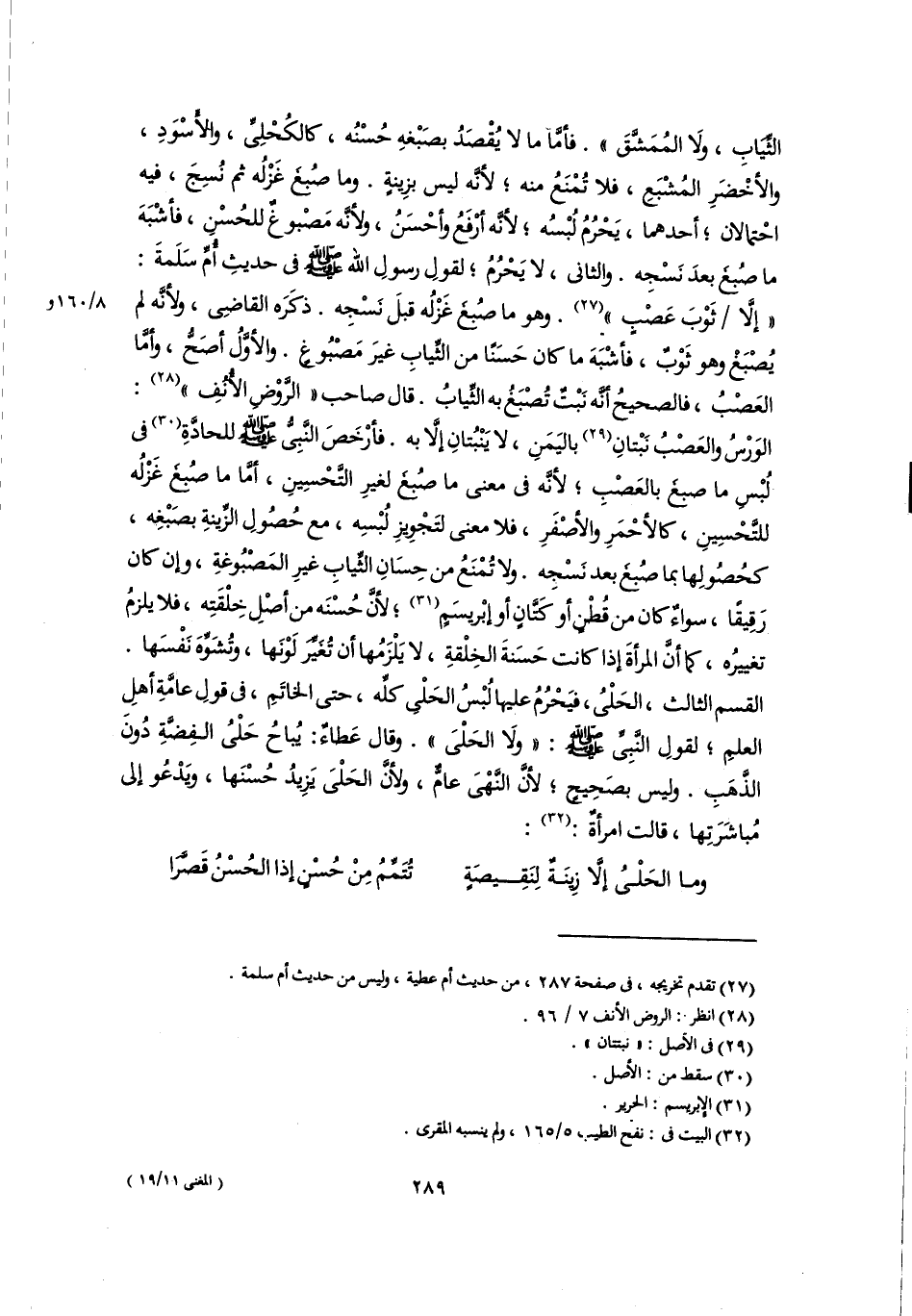 الثِّيَابِ، وَلا المُمَشَّقَ". فأمَّا ما لا يُقْصَدُ بصَبْغهِ حُسْنُه، كالكُحْلِيِّ، والأَسْوَدِ، والأخْضَرِ المُشْبَعِ، فلا تُمْنَعُ منه؛ لأنَّه ليس بزِينةٍ. وما صُبِغَ غَزْلُه ثم نُسِجَ، فيه احْتمالان؛ أحدهما، يَحْرُمُ لُبْسُه؛ لأنَّه أرْفَعُ وأحْسَنُ، ولأنَّه مَصْبوغٌ للحُسْنِ، فأشْبَهَ ما صُبِغَ بعدَ نَسْجِه. والثانى، لا يَحْرُمُ؛ لقولِ رسولِ اللَّه -صلى اللَّه عليه وسلم- في حديثِ أُمِّ سَلَمةَ: "إلَّا ثَوْبَ عَصْبٍ" (٢٧). وهو ما صُبِغَ غَزْلُه قبلَ نَسْجِه. ذكَرَه القاضِى، ولأنَّه لم يُصْبَغْ وهو ثَوْبٌ، فأشْبَهَ ما كان حَسَنًا من الثِّيابِ غيرَ مَصْبُوغٍ. والأوَّلُ أصَحُّ، وأمَّا العَصْبُ، فالصحيحُ أنَّه نَبْتٌ تُصْبَغُ به الثِّيابُ. قال صاحب "الرَّوْضِ الأُنُفِ" (٢٨): الوَرْسُ والعَصْبُ نَبْتانِ (٢٩) باليَمَنِ، لا يَنْبُتانِ إلَّا به. فأرْخَصَ النَّبِيُّ -صلى اللَّه عليه وسلم- للحادَّةِ (٣٠) في لُبْسِ ما صبِغَ بالعَصْبِ؛ لأنَّه في معنى ما صُبِغَ لغيرِ التَّحْسِينِ، أمَّا ما صُبِغَ غَزْلُه للتَّحْسِينِ، كالأحْمَرِ والأصْفَرِ، فلا معنى لتَجْوِيزِ لُبْسِه، مع حُصُولِ الزِّينةِ بصَبْغِه، كحُصُولِها بما صُبِغَ بعد نَسْجِه. ولا تُمْنَعُ من حِسَانِ الثِّيابِ غيرِ المَصْبُوغةِ، وإن كان رَقِيقًا، سواءٌ كان من قُطْنٍ أو كَتَّانٍ أو إبْريسَمٍ (٣١)؛ لأنَّ حُسْنَه من أصْلِ خِلْقَتِه، فلا يلزمُ تغييرُه، كما أنَّ المرأةَ إذا كانت حَسَنةَ الخِلْقةِ، لا يَلْزَمُها أن تُغَيِّرَ لَوْنَها، وتُشَوِّهَ نَفْسَها. القسم الثالث، الحَلْىُ، فيَحْرُمُ عليها لُبْسُ الحَلْيِ كلِّه، حتى الخاتَمِ، في قولِ عامَّةِ أهلِ العلمِ؛ لقولِ النَّبِيِّ -صلى اللَّه عليه وسلم-: "وَلا الحَلْىَ". وقال عَطاءٌ: يُباحُ حَلْىُ الفِضَّةِ دُونَ الذَّهَبِ. وليس بصَحِيحٍ؛ لأنَّ النَّهْىَ عامٌّ، ولأنَّ الحَلْىَ يَزِيدُ حُسْنَها، ويَدْعُو إلى مُباشَرَتِها، قالت امرأةٌ: (٣٢):