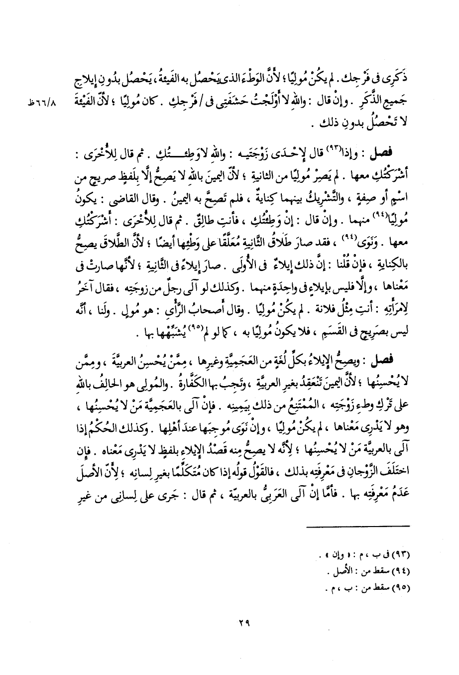 فصل: ويصِحُّ الإِيلاءُ بكلِّ لُغَةٍ من العَجَمِيَّةِ وغيرِها، مِمَّنْ يُحْسِنُ العربيَّةَ، ومِمَّن لا يُحْسِنُها؛ لأنَّ اليمينَ تَنْعَقِدُ بغيرِ العربيَّةِ، وتَجِبُ بها الكَفَّارةُ. والمُولِى هو الحالِفُ باللَّهِ على تَرْكِ وطءِ زَوْجَتِه، المُمْتَنِعُ من ذلك بِيَمِينِه. فإنْ آلَى بالعَجَمِيَّة مَنْ لا يُحْسِنُها، وهو لا يَدْرِى مَعْناها، لم يكُنْ مُولِيًا، وإِنْ نَوَى مُوجِبَها عندَ أهْلِها. وكذلك الحُكْمُ إذا آلَى بالعربيَّة مَنْ لا يُحْسِنُها؛ لِأنَّه لا يصِحُّ مِنه قَصْدُ الإِيلاء بلفظٍ لا يَدْرِى مَعْناه. فإِن اختَلَفَ الزَّوْجانِ فى مَعْرِفَتِه بذلك، قالقَوْلُ قولُه إذا كان مُتَكَلِّمًا بغيرِ لِسانِه؛ لِأَنّ الأصلَ عَدَمُ مَعْرِفَتِه بها. فأمَّا إنْ آلى العَرَبِىُّ بالعربيّة، ثم قال: جَرى على لِسانِى من غيرِ
