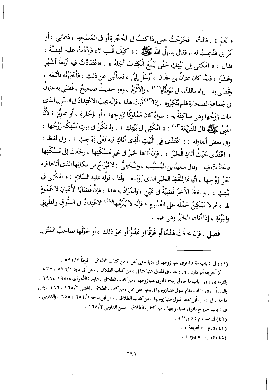 "نَعَمْ". قالتْ: فخَرَجْتُ حتى إذا كنتُ في الحُجْرةِ أو في المَسْجِدِ، دَعانِى، أو أمَرَ لي فدُعِيتُ له، فقال رسولُ اللَّه -صلى اللَّه عليه وسلم-: "كَيْفَ قُلْتِ؟ " فرَدَّدْتُ عليه القِصَّةَ، فقال: "امْكُثِى في بَيْتِكِ حَتَّى يَبْلُغَ الْكِتَابُ أجَلَهُ". فاعْتَدَدْتُ فيه أرْبعةَ أشْهُرٍ وعَشْرًا، فلمَّا كان عثمانُ بن عَفّان، أرْسَلَ إليَّ، فسألَنِى عن ذلك، فأخْبَرْتُه فاتَّبَعَه، وقَضَى به. رواه مالكٌ، في مُوَطَّأهِ (٤١)، والأثْرَمُ، وهو حديثٌ صحيحٌ، قَضَى به عثمانُ في جَماعةِ الصحابةِ فلم يُنْكِرُوه. إذا (٤٢) ثَبَتَ هذا، فإنَّه يجبُ الاعْتِدادُ في المَنْزِلِ الذي مات زَوْجُها وهى ساكِنَةٌ به، سواءٌ كان مَمْلوكًا لزَوْجِها، أو بإجَارةٍ، أو عارِيَّةٍ؛ لأنَّ النَّبِيِّ -صلى اللَّه عليه وسلم- قال للفُرَيْعَةِ (٤٣): "امْكُثِى في بَيْتِكِ". ولم تكُنْ في بيتٍ يَمْلِكُه زَوْجُها، وفى بعضِ ألفاظِه: "اعْتَدِّى فِي الْبَيْتِ الَّذِى أتَاكِ فِيه نَعْىُ زَوْجِكِ". وفى لفظ: "اعْتَدِّى حَيْثُ أتَاكِ الْخَبَرُ". فإنْ أتاها الخبرُ في غيرِ مَسْكَنِها، رَجَعَتْ إلى مَسْكَنِها فاعْتَدَّتْ فيه. وقال سعيدُ بن المُسَيَّبِ، والنَّخَعِيُّ: لا تَبْرَحُ من مكانِها الذي أتاها فيه نَعْىُ زَوْجِها، اتِّباعًا لِلَفْظِ الخَبَرِ الذي رَوَيْناه. ولَنا، قولُه عليه السَّلام: "امْكُثِى في بَيْتِكِ". واللفظُ الآخرُ قَضِيّةٌ في عَيْنٍ، والمُرَادُ به هذا، فإنَّ قَضَايَا الأعْيانِ لا عُمُومَ لها، ثم لا يُمْكِنُ حَمْلُه على العُمُومِ؛ فإنَّه لا يَلْزَمُها (٤٤) الاعْتِدادُ في السُّوقِ والطَّرِيقِ والبَرِّيَّةِ، إذا أتاها الخَبَرُ وهى فيها.