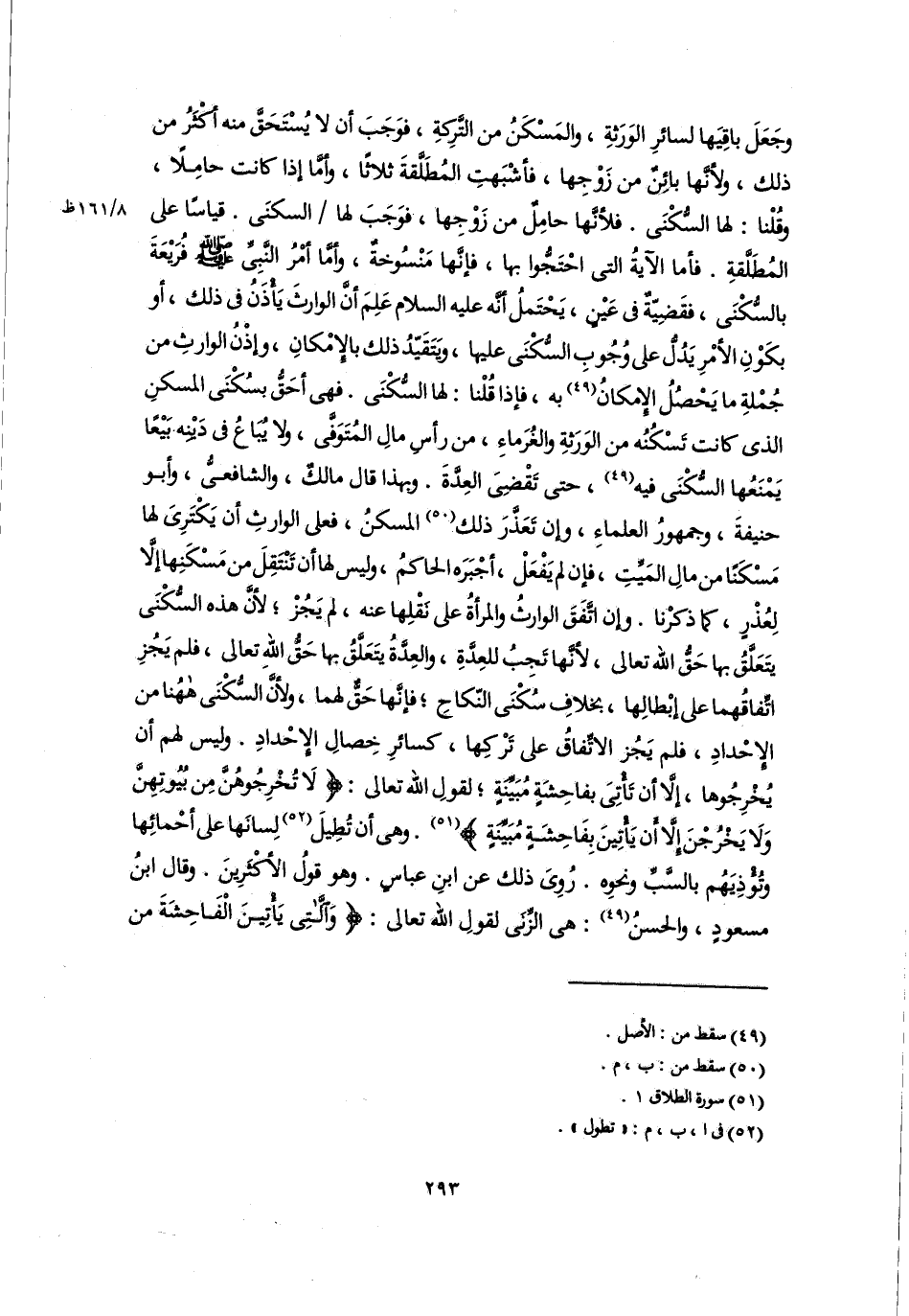 وجَعَلَ باقِيَها لسائرِ الوَرَثةِ، والمَسْكَنُ من التَّرِكةِ، فوَجَبَ أن لا يُسْتَحَقَّ منه أكْثَرُ من ذلك، ولأنَّها بائِنٌ من زَوْجِها، فأشْبَهتِ المُطَلَّقةَ ثلاثًا، وأمَّا إذا كانت حامِلًا، وقُلْنا: لها السُّكْنَى. فلأنَّها حامِلٌ من زَوْجِها، فوَجَبَ لها السكنَى. قياسًا على المُطَلَّقةِ. فأما الآيةُ التي احْتَجُّوا بها، فإنَّها مَنْسُوخةٌ، وأمَّا أمْرُ النَّبِيِّ -صلى اللَّه عليه وسلم- فُرَيْعَةَ بالسُّكْنَى، فقَضِيّةٌ في عَيْنٍ، يَحْتَملُ أنَّه عليه السلام عَلِمَ أنَّ الوارثَ يَأْذَنُ في ذلك، أو بكَوْنِ الأمْرِ يَدُلُّ على وُجُوبِ السُّكْنَى عليها، ويَتَقَيّدُ ذلك بالإِمْكانِ، وإذْنُ الوارثِ من جُمْلةِ ما يَحْصُلُ الإِمكانُ (٤٩) به، فإذا قُلْنا: لها السُّكْنَى. فهى أحَقُّ بسُكْنَى المسكنِ الذي كانت تَسْكُنُه من الوَرَثةِ والغُرَماءِ، من رأسِ مالِ المُتَوَفَّى، ولا يُبَاعُ في دَيْنِه بَيْعًا يَمْنَعُها السُّكْنَى فيه (٤٩)، حتى تَقْضِىَ العِدَّةَ، وبهذا قال مالكٌ، والشافعيُّ، وأبو حنيفةَ، وجمهورُ العلماءِ، وإن تَعَذَّرَ ذلك (٥٠) المسكنُ، فعلى الوارثِ أن يَكْتَرِىَ لها مَسْكَنًا من مالِ المَيِّتِ، فإن لم يَفْعَلْ، أجْبَرَه الحاكمُ، وليس لها أن تَنْتَقِلَ من مَسْكَنِها إلَّا لِعُذْرٍ، كما ذكرْنا. وإن اتَّفَقَ الوارثُ والمرأةُ على نَقْلِها عنه، لم يَجُزْ؛ لأنَّ هذه السُّكْنَى يتَعَلَّقُ بها حَقُّ اللَّه تعالى، لأنَّها تَجِبُ للعِدَّةِ، والعِدَّةُ يتَعَلَّقُ بها حَقُّ اللهِ تعالى، فلم يَجُزِ اتِّفاقُهما على إبْطالِها، بخلافِ سُكْنَى النّكاحِ؛ فإنَّها حَقٌّ لهما، ولأنَّ السُّكْنَى ههُنا من الإِحْدادِ، فلم يَجُز الاتِّفاقُ على تَرْكِها، كسائرِ خِصالِ الإِحْدادِ. ليس لهم أن يُخْرِجُوها، إلَّا أن تَأْتِىَ بفاحِشَةٍ مُبَيِّنَةٍ؛ لقولِ اللَّه تعالى: {لَا تُخْرِجُوهُنَّ مِنْ بُيُوتِهِنَّ وَلَا يَخْرُجْنَ إِلَّا أَنْ يَأْتِينَ بِفَاحِشَةٍ مُبَيِّنَةٍ} (٥١). وهى أن تُطِيلَ (٥٢) لِسانَها على أحْمائِها وتُؤْذِيَهُم بالسَّبِّ ونحوِه. رُوِىَ ذلك عن ابنِ عباسٍ. وهو قولُ الأكْثَرِينَ. وقال ابنُ مسعودٍ، والحسنُ (٤٩): هي الزِّنَى لقولِ اللَّه تعالى: {وَاللَّاتِي يَأْتِينَ الْفَاحِشَةَ مِنْ