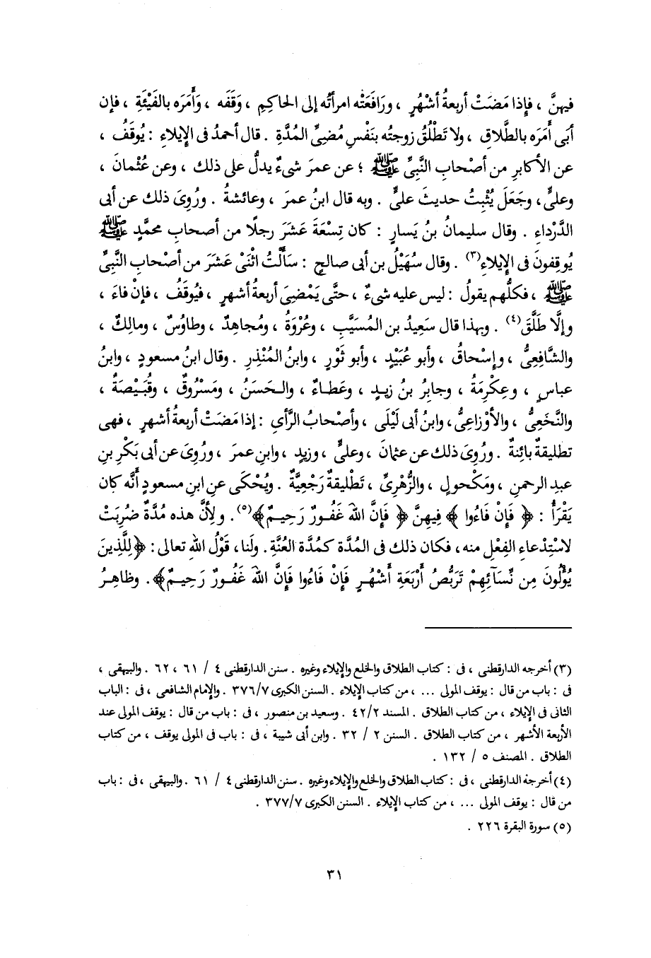 (٤) أخرجه الدارقطنى، فى: كتاب الطلاق والخلع والإيلاء وغيره. سنن الدارقطنى ٤/ ٦١. والبيهقى، فى: باب من قال: يوقف المولى. . .، من كتاب الإيلاء. السنن الكبرى ٧/ ٣٧٧.