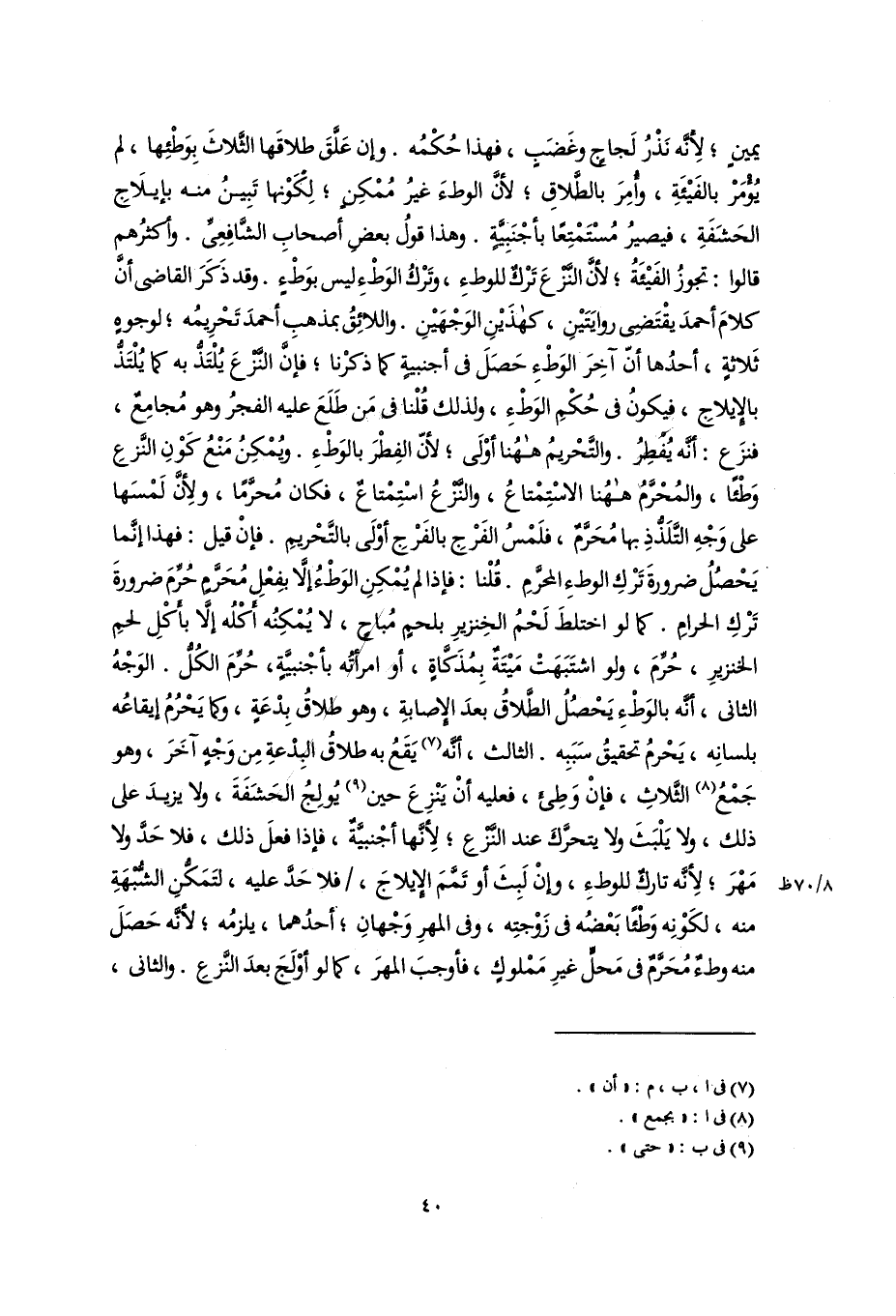 يمينٍ؛ لِأنَّه نَذْرُ لَجاجٍ وغَضَبٍ، فهذا حُكْمُه. وإن عَلَّقَ طلاقَها الثَّلاثَ بِوَطْئِها، لم يُؤْمَرْ بالفَيْئَةِ، وأُمِرَ بالطَّلاقِ؛ لأنَّ الوطءَ غيرُ مُمْكِنٍ؛ لِكَوْنها تَبِينُ منه بإيلَاجِ الحَشَفَةِ، فيصيرُ مُسْتَمْتِعًا بأجْنَبِيَّةٍ. وهذا قولُ بعضِ أصحابِ الشَّافِعِىِّ. وأكثرُهم قالوا: تجوزُ الفَيْئَةُ؛ لأنَّ النَّزْعَ تَرْكٌ للوطءِ، وتَرْكُ الوَطْءِ ليس بوَطْءٍ. وقد ذَكَرَ القاضى أَنَّ كلامَ أحمدَ يقْتَضِى روايَتَيْنِ، كهذَيْنِ الوَجْهَيْنِ. واللائِقُ بمذهبِ أحمدَ تَحْرِيمُه؛ لوجوهٍ ثَلاثةٍ، أحدُها أنّ آخِرَ الوَطْءِ حَصَلَ فى أجنبيةٍ كما ذكرْنا؛ فإنَّ النَّزْعَ يُلْتَذُّ به كما يُلْتَذُّ بالإِيلاجِ، فيكونُ فى حُكْمِ الوَطْءِ، ولذلك قُلْنا فى مَن طَلَعَ عليه الفجرُ وهو مُجامِعٌ، فنزَع: أنَّه يُفْطِرُ. والتَّحْريمُ ههُنا أوْلَى؛ لأنّ الفِطْرَ بالوَطْءِ. ويُمْكِنُ مَنْعُ كَونِ النَّزعِ وَطْئًا، والمُحْرَّمُ ههُنا الاسْتِمْتاعُ، والنَّزْعُ اسْتِمْتاعٌ، فكان مُحرَّمًا، ولِأَنَّ لَمْسَها على وَجْهِ التَّلَذُّذِ بها مُحَرَّمٌ، فلَمْسُ الفَرْجِ بالفَرْجِ أوْلَى بالتَّحْريمِ. فإنْ قيل: فهذا إنَّما يَحْصُلُ ضرورةَ تَرْكِ الوطءِ المحرَّمِ. قُلْنا: فإذا لم يُمْكِنِ الوَطْءُ إلَّا بفِعْلِ مُحَرَّمٍ حُرِّمَ ضرورةَ تَرْكِ الحرامِ. كما لو اختلطَ لَحْمُ الخِنزيرِ بلحمٍ مُباحٍ, لا يُمْكِنُه أَكْلُه إلَّا بأَكْلِ لحمِ الخنزيرِ، حُرِّمَ، ولو اشتَبَهَتْ مَيْتَةٌ بِمُذَكَّاةٍ، أو امرأتُه بأجْنبيَّةٍ، حُرِّمَ الكُلُّ. الوَجْهُ الثانى, أنَّه بالوَطْءِ يَحْصُلُ الطَّلاقُ بعدَ الإِصابةِ، وهو طلاقُ بِدْعَةٍ، وكما يَحْرُمُ إيقاعُه بلسانِه، يَحْرمُ تحقيقُ سَبَبِه. الثالث، أنَّه (٧) يَقَعُ به طلاقُ البِدْعةِ مِن وَجْهٍ آخَرَ، وهو جَمْعُ (٨) الثَّلاثِ، فإنْ وَطِىءَ، فعليه أَنْ يَنْزِعَ حين (٩) يُولِجُ الحَشَفَةَ، ولا يزيدَ على ذلك، ولا يَلْبَثَ ولا يتحرَّكَ عند النَّزْعِ؛ لِأنَّها أجْنبيَّةٌ، فإذا فعلَ ذلك، فلا حَدَّ ولا مَهْرَ؛ لِأنَّه تاركٌ للوطءِ، وإِنْ لَبِثَ أو تَمَّمَ الإِيلاجَ، فلا حَدَّ عليه، لتَمَكُّنِ الشُّبْهَةِ منه، لكَوْنِه وَطْئًا بَعْضُه فى زَوْجتِه، وفى المهرِ وَجْهانِ؛ أحدُهما، يلزمُه؛ لأنَّه حَصَلَ منه وطءٌ مُحَرَّمٌ فى مَحلٍّ غيرِ مَمْلوكٍ، فأوجبَ المهرَ، كما لو أوْلَجَ بعدَ النَّزعِ. والثانى،