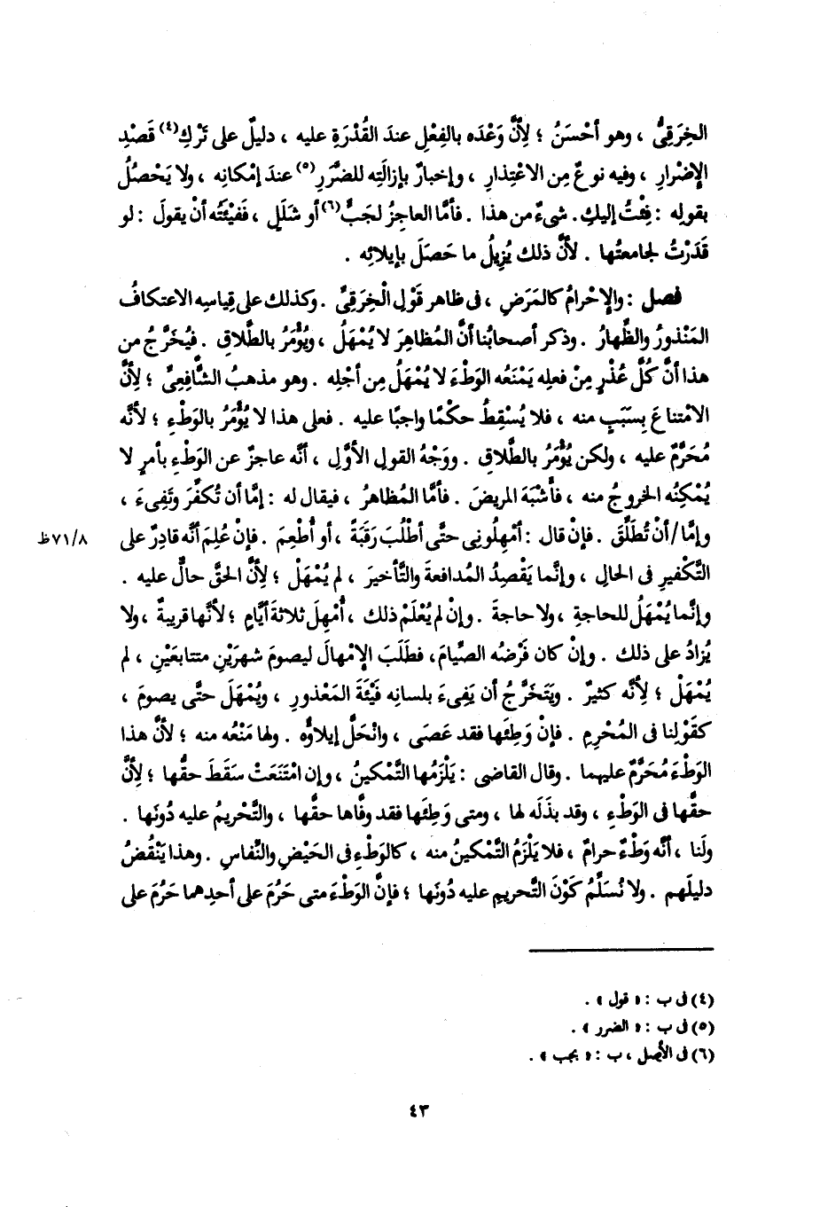 فصل: والإِحْرامُ كالمَرَضِ، فى ظاهر قَوْلِ الْخِرَقِىِّ. وكذلك على قِياسِه الاعتكافُ المَنْذورُ والظِّهارُ. وذكر أصحابُنا أَنَّ المُظاهِرَ لا يُمْهَلُ، ويُؤْمَرُ بالطَّلاقِ. فيُخَرَّجُ من هذا أَنَّ كُلَّ عُذْرٍ مِنْ فعلِه يَمْنَعُه الوَطْءَ لا يُمْهَلُ مِن أجْلِه. وهو مذهبُ الشَّافِعِىِّ؛ لِأنَّ الامْتناعَ بِسَبَبٍ منه، فلا يُسْقِطُ حكْمًا واجبًا عليه. فعلى هذا لا يُؤْمَرُ بالوَطءِ؛ لأنَّه مُحَرَّمٌ عليه، ولكن يُؤْمَرُ بالطَّلاقِ. ووَجْهُ القولِ الأوَّلِ، أنَّه عاجزٌ عن الوَطْءِ بأمرٍ لا يُمْكِنُه الخروجُ منه، فأَشْبَهَ المريضَ. فأمَّا المُظاهرُ، فيقال له: إمَّا أن تُكفِّرَ وتَفِىءَ، وإمَّا أَنْ تُطَلِّقَ. فإنْ قال: أمْهِلُونِى حتَّى أطْلُبَ رَقَبَةً، أو أُطْعِمَ. فإنْ عُلِمَ أنَّه قادِرٌ على التَّكْفيرِ فى الحالِ، وإنَّما يَقْصِدُ المُدافعةَ والتَّأخيرَ، لم يُمْهَلْ؛ لِأنَّ الحقَّ حالٌّ عليه. وإنَّما يُمْهَلُ للحاجةِ، ولا حاجةَ. وإِنْ لم يُعْلَمْ ذلك، أُمْهِلَ ثلاثةَ أيَّامٍ؛ لأنَّها قريبةٌ، ولا يزادُ على ذلك. وإِنْ كان فَرْضُه الصِّيامَ، فطَلَبَ الإِمْهالَ ليصومَ شهرَيْنِ متتابعَيْنِ، لم يُمْهَلْ؛ لِأنَّه كثيرٌ. ويَتَخَرَّجُ أن يَفِىءَ بلسانِه فَيْئَةَ المَعْذورِ، ويُمْهَلَ حتَّى يصومَ، كقَوْلِنا فى المُحْرِمِ. فإنْ وَطِئَها فقد عَصَى، وانْحَلَّ إيلاؤُه. ولها مَنْعُه منه؛ لأنَّ هذا الوَطْءَ مُحَرَّمٌ عليهما. وقال القاضى: يَلْزَمُها التَّمْكينُ، وإن امْتَنَعَتْ سَقَطَ حقُّها؛ لِأنَّ حقَّها فى الوَطْءِ، وقد بذَلَه لها، ومتى وَطِئَها فقد وفَّاها حقَّها، والتَّحْريمُ عليه دُونَها. ولَنا، أنَّه وَطْءٌ حرامٌ، فلا يَلْزَمُ التَّمْكينُ منه، كالوَطْءِ فى الحَيْضِ والنِّفاسِ. وهذا يَنْقُضُ دليلَهم. ولا نُسَلِّمُ كَوْنَ التَّحريمِ عليه دُونَها؛ فإنَّ الوَطْءَ متى حَرُمَ على أحدِهما حَرُمَ على