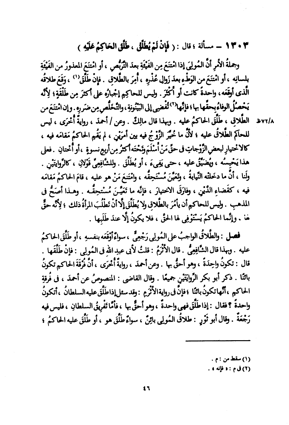 فصل: والطَّلاقُ الواجبُ على المُولِى رَجْعِىٌّ، سواءٌ أوْقَعَه بنفسهِ، أو طَلَّقَ الحاكمُ عليه. وكذا قال الشَّافِعِىُّ. قال الأثْرَمُ: قلتُ لأبى عبدِ اللَّهِ فى المُولِى: فإنْ طَلَّقَها. قال: تكونُ واحِدَةً، وهو أحقُّ بها. وعن أحمدَ، روايةٌ أُخْرَى، أَنَّ فُرْقَةَ الحاكمِ تكونُ بائنًا. ذكر أبو بكر الرِّوايَتَيْنِ جميعًا. وقال القاضى: المنصوصُ عن أحمدَ، فى فُرقةِ الحاكمِ, أنَّها تكونُ بائنًا؛ فإنَّ فى رواية الأثْرَمِ: وقد سئل إذا طَلَّقَ عليه السلطانُ، أتكونُ واحدةً؟ فقال: إذا طَلَّقَ فهى واحدةٌ، وهو أحقٌّ بها، فأمَّا تَفْرِيقُ السلطانِ، فليس فيه رَجْعَةٌ. وقال أبو ثَوْرٍ: طلاقُ المُولِى بائِنٌ، سواءٌ طَلَّقَ هو، أو طَلَّقَ عليه الحاكمُ؛