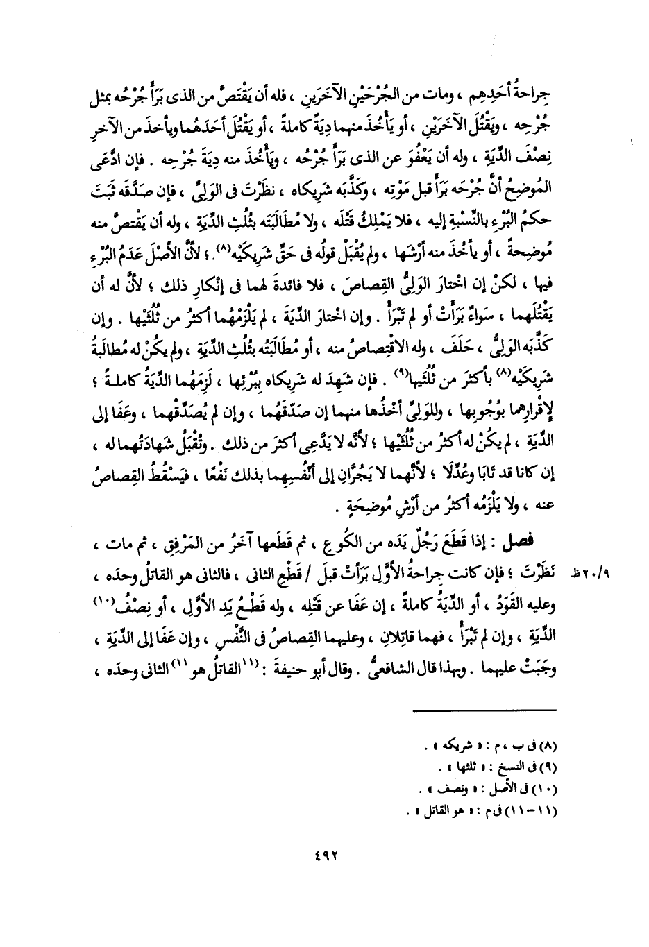 فصل: إذا قَطَعَ رَجُلٌ يَدَه من الكُوعِ، ثم قَطَعها آخَرُ من المَرْفِقِ، ثم مات، نَظَرْتَ؛ فإن كانت جِراحةُ الأوَّلِ بَرَأتْ قبلَ قَطْعِ الثاني، فالثاني هو القاتلُ وحدَه، وعليه القَوَدُ، أو الدِّيَةُ كاملةً، إن عَفَا عن قَتْلِه، وله قَطْعُ يَدِ الأوَّلِ، أو نِصْفُ (١٠) الدِّيَةِ، وإن لم تَبْرَأْ، فهما قاتِلانِ، وعليهما القِصاصُ في النَّفْسِ، وإن عَفَا إلى الدِّيَةِ، وجَبَتْ عليهما. وبهذا قال الشافعيُّ. وقال أبو حنيفةَ: [القاتلُ هو] (١١) الثاني وحدَه،