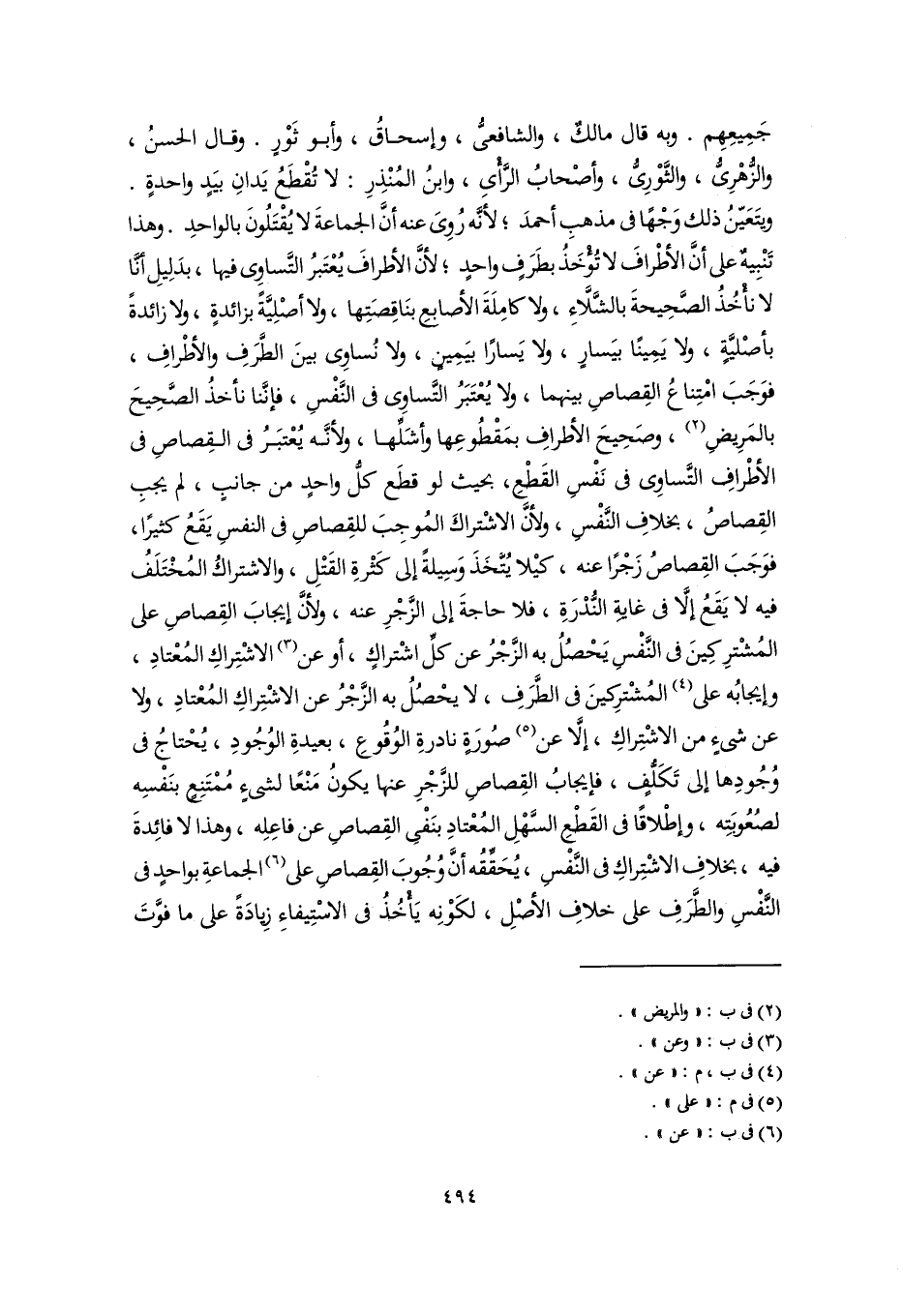جَمِيعِهِم. وبه قال مالكٌ، والشافعيُّ، وإسحاقُ، وأبو ثَوْرٍ. وقال الحسنُ، والزُّهْرِيُّ، والثَّوْرِيُّ، وأصْحابُ الرَّأْيِ، وابنُ المُنْذِرِ: لا تُقْطَعُ يَدانِ بيَدٍ واحدةٍ. ويتَعَيّنُ ذلك وَجْهًا في مذهبِ أحمدَ؛ لأنَّه رُوِيَ عنه أنَّ الجماعةَ لا يُقْتَلُونَ بالواحدِ. وهذا تَنْبِيهٌ على أنَّ الأطْرافَ لا تُؤْخَذُ بطَرَفٍ واحدٍ؛ لأنَّ الأطرافَ يُعْتَبرُ التَّساوِي فيها، بدَلِيلِ أنَّا لا نأْخُذُ الصَّحِيحةَ بالشَّلَّاءِ، ولا كامِلَةَ الأصابِعِ بنَاقِصَتِها، ولا أصْلِيَّةً بزائدةٍ، ولا زائدةً بأصْليَّةٍ، ولا يَمِينًا بيَسارٍ، ولا يَسارًا بيَمِينٍ، ولا نُساوِي بينَ الطَّرَفِ والأطْرافِ، فوَجَبَ امْتِناعُ القِصاصِ بينهما، ولا يُعْتَبَرُ التَّساوِي في النَّفْسِ، فإنَّنا نأخذُ الصَّحِيحَ بالمَرِيضِ (٢)، وصَحِيحَ الأطرافِ بمَقْطُوعِها وأشَلِّها، ولأنَّه يُعْتبَرُ في القِصاصِ في الأطْرافِ التَّساوِي في نَفْسِ القَطْعِ، بحيث لو قطَع كلُّ واحدٍ من جانبٍ، لم يجبِ القِصاصُ، بخلافِ النَّفْسِ، ولأنَّ الاشْتراكَ المُوجِبَ للقِصاصِ في النفسِ يَقَعُ كثيرًا، فوَجَبَ القِصاصُ زَجْرًا عنه، كيْلا يُتَّخَذَ وَسِيلةً إلى كَثْرةِ القَتْلِ، والاشتراكُ المُخْتَلَفُ فيه لا يَقَعُ إلَّا في غايةِ النُّدْرَةِ، فلا حاجةَ إلى الزَّجْرِ عنه، ولأنَّ إيجابَ القِصاصِ على المُشْترِكِينَ في النَّفْسِ يَحْصُلُ به الزَّجْرُ عن كلِّ اشْتراكٍ، أو عن (٣) الاشْتِراكِ المُعْتادِ، وإيجابُه على (٤) المُشْترِكينَ في الطَّرَفِ، لا يحْصُلُ به الزَّجْرُ عن الاشْتِراكِ المُعْتادِ، ولا عن شيءٍ من الاشْتِراكِ، إلَّا عن (٥) صُورَةٍ نادرةِ الوُقُوعِ، بعيدةِ الوُجُودِ، يُحْتاجُ في وُجُودِها إلى تَكَلُّفٍ، فإيجابُ القِصاصِ للزَّجْرِ عنها يكونُ مَنْعًا لشىءٍ مُمْتَنِعٍ بنَفسِه لصُعُوبَتِه، وإطْلاقًا في القَطْعِ السَّهْلِ المُعْتادِ بنَفْيِ القِصاصِ عن فاعِلِه، وهذا لا فائِدةَ فيه، بخلافِ الاشْتِراكِ في النَّفْسِ، يُحَقِّقُه أنَّ وُجُوبَ القِصاصِ على (٦) الجماعةِ بواحدٍ في النَّفْسِ والطَّرَفِ على خلافِ الأصْلِ، لكَوْنِه يَأْخُذُ في الاسْتِيفاءِ زِيادَةً على ما فوَّتَ
