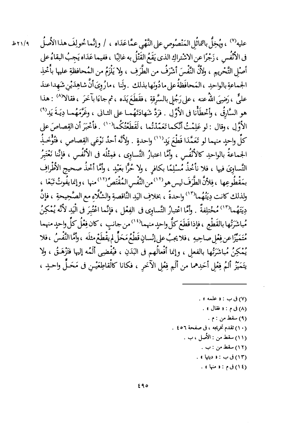 عليه (٧)، ويُخِلُّ بالتماثُلِ المَنْصُوصِ على النَّهْيِ عمَّا عَدَاه، وإنَّما خُولِفَ هذا الأصلُ في الأنْفُسِ، زَجْرًا عن الاشْتراكِ الذي يَقَعُ القَتْلُ به غالِبًا، ففيما عَدَاه يَجِبُ البقاءُ على أصْلِ التَّحْريمِ، ولأنَّ النَّفسَ أشْرَفُ من الطَّرَفِ، ولا يَلْزَمُ من المُحافظةِ عليها بأَخْذِ الجماعةِ بالواحدِ، المَحافَظةُ على ما دُونَها بذلك. ولَنا، ما رُوِيَ أنَّ شاهِدَيْنِ شَهِدا عندَ عليٍّ، رَضِيَ اللهُ عنه، على رَجُلٍ بالسَّرِقةِ، فقَطَعَ يَدَه، ثم جاءَا بآخَرَ، فقالا (٨): هذا هو السَّارِقُ، وأخْطَأْنا في الأوَّلِ. فرَدَّ شَهادَتَهُما على الثاني، وغَرَّمَهُما دِيَةَ يَدِ (٩) الأوَّلِ، وقال: لو عَلِمْتُ أنَّكما تَعَمّدْتُما، لَقَطَعْتُكُما (١٠). فأخْبَرَ أن القِصاصَ على كلِّ واحدٍ منهما لو تَعَمَّدَا قَطْعَ يَدٍ (١١) واحدةٍ. ولأنَّه أحدُ نَوْعَيِ القِصاصِ، فتُؤْخَذُ الجماعةُ بالواحدِ كالأنْفُسِ، وأمَّا اعتبارُ التَّساوِي، فمِثْلُه في الأنْفُسِ، فإنَّنا نَعْتَبِرُ التَّساوِىَ فيها، فلا نأخُذُ مُسْلِمًا بكافرٍ، ولا حُرًّا بعَبْدٍ، وأمَّا أخْذُ صحيحِ الأطْرافِ بمَقْطُوعِها، فَلأنَّ الطَّرَفَ ليس هو (١٢) من النَّفْسِ المُقْتَصِّ (١٢) منها، وإنما يفُوتُ تَبَعًا، ولذلك كانت دِيَتُهُما (١٣) واحدةً، بخلافِ اليَدِ النَّاقصةِ والشَّلَّاءِ مع الصَّحِيحةِ، فإنَّ دِيَتَهُما (١٣) مُخْتلِفةٌ. وأمَّا اعْتبارُ التَّساوِي في الفِعْل، فإنَّما اعْتُبِرَ في الْيَدِ لأنَّه يُمْكِنُ مُباشَرَتُها بالقَطْعِ، فإذا قَطَعَ كلُّ واحدٍ منهما (١٤) من جانبٍ، كان فِعْلُ كلِّ واحدٍ منهما مُتَمَيِّزًا عن فِعْلِ صاحِبهِ، فلا يجبُ على إنْسانٍ قَطْعُ مَحَلٍّ لم يقْطَعْ مثلَه، وأمَّا النَّفْسُ، فلا يُمْكِنُ مُباشَرَتُها بالفعلِ، وإنما أفْعالُهم في البَدَنِ، فيُفْضِي ألَمُه إليها فتَزْهَقُ، ولا يتَمَيّزُ ألمُ فِعْلِ أحَدِهما من ألَمِ فِعْلِ الآخَرِ، فكانا كالْقاطِعَيْنِ في مَحَلٍّ واحدٍ،