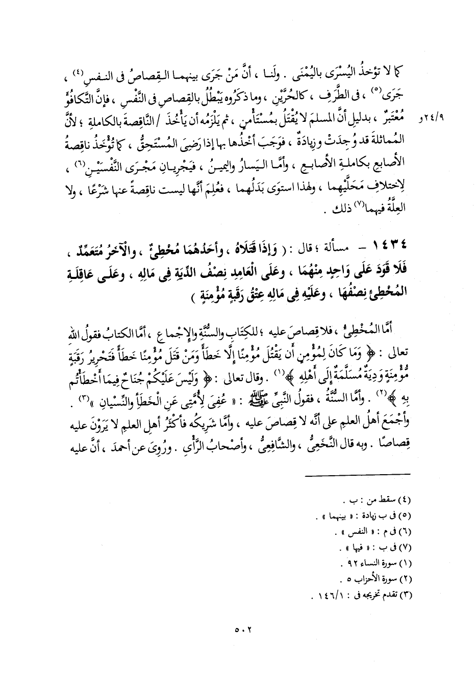 أمَّا المُخْطِيءُ، فلا قِصاصَ عليه، للكِتَاب والسُّنَّةِ والإِجْماعِ، أمَّا الكتابُ فقولُ اللهِ تعالى: {وَمَا كَانَ لِمُؤْمِنٍ أَنْ يَقْتُلَ مُؤْمِنًا إِلَّا خَطَأً وَمَنْ قَتَلَ مُؤْمِنًا خَطَأً فَتَحْرِيرُ رَقَبَةٍ مُؤْمِنَةٍ وَدِيَةٌ مُسَلَّمَةٌ إِلَى أَهْلِهِ} (١). وقال تعالى: {وَلَيْسَ عَلَيْكُمْ جُنَاحٌ فِيمَا أَخْطَأْتُمْ بِهِ} (٢). وأمَّا السُّنَّةُ، فقولُ النَّبِيِّ -صلى اللَّه عليه وسلم-: "عُفِيَ لِأُمَّتِي عَنِ الْخَطَإِ والنِّسْيانِ" (٣). وأجْمَعَ أهلُ العلمِ على أنَّه لا قِصاصَ عليه، وأمَّا شَرِيكُه فأكْثَرُ أهلِ العلمِ لا يَرَوْنَ عليه قِصاصًا. وبه قال النَّخَعِيُّ، والشَّافِعِيُّ، وأصْحابُ الرَّأْيِ. ورُوِيَ عن أحمدَ، أنَّ عليه