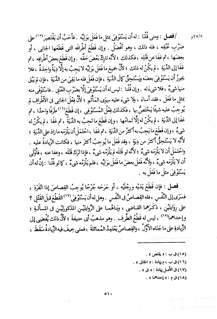 فصل: ومتى قُلْنَا: له أن يَسْتَوْفِىَ بمثلِ ما فَعَلَ بوَلِيِّه. فأحَبَّ أن يَقْتَصِرَ (١٥) على ضَرْبِ عُنُقِه، فله ذلك، وهو أفْضَلُ. وإن قَطعَ أطْرافَه التي قَطَعَها الجانِى، أو بعضَها، ثم عَفَا عن قَتْلِه، فكذلك؛ لأنَّه تارِكٌ بَعْضَ حَقِّه. وإن قَطَعَ بعضَ أطْرافِه، ثم عَفَا إلى الدِّيَةِ، لم يكُنْ له ذلك؛ لأنَّ جميعَ ما فَعَلَ بوَلِيِّه لا يَجِبُ به إلَّا دِيَةٌ واحِدَةٌ، فلا يجوزُ أن يَسْتَوْفِىَ بعضَه ويَسْتَحِقَّ كمالَ الدِّيَةِ، فإن فَعَلَ فله ما بَقِىَ من الدِّيَةِ، فإن لم يَبْقَ منها شيءٌ، فلا شىءَ له. وإن قُلْنا: ليس له أن يَسْتَوْفِىَ إلَّا بضَرْبِ العُنُقِ. فاسْتَوْفَى منه بمثلِ ما فَعَلَ، فقد أساءَ، ولا شىءَ عليه سِوَى المَأْثَمِ؛ لأنَّ فِعْلَ الجانِى في الأطْرافِ لم يُوجِبْ عليه شيئًا يَخْتَصُّ بها، فكذلك فِعْلُ المُسْتَوْفِى، إن قَطعَ (١٦) طَرَفًا واحدًا، ثم عَفَا إلى الدِّيَةِ، لم يكُنْ له إلَّا تَمامُها، وإن قَطعَ ما تَجِبُ به الدِّيَةُ، ثم عَفَا، لم يكُنْ له شيءٌ، وإن قَطعَ ما يَجِبُ به أكثرُ من الدِّيَةِ، ثم عَفَا، احْتَمَلَ أن يَلْزَمَه ما زادَ على الدِّيَةِ؛ لأنَّه لا يَسْتَحِقُّ أكثرَ من دِيَةٍ، وقد فَعَلَ ما يُوجِبُ اكثرَ منها، فكانت الزِّيادةُ عليه. واحْتَمَلَ أن لا يَلْزَمَه شيءٌ؛ لأنَّه لو قَتَلَه لم يَلْزَمْه شيءٌ، فإذا تَرَكَ قَتْلَه، وعفا عنه، فأَوْلَى أن لا يَلْزَمَه شيءٌ، ولأنَّه فَعَلَ بعضَ ما فَعَلَ بوَلِيِّه، فلم يَلْزَمْه شيءٌ، كما لو قُلْنا: إنَّ له أن يَسْتَوْفِىَ مثلَ ما فَعَلَ به.