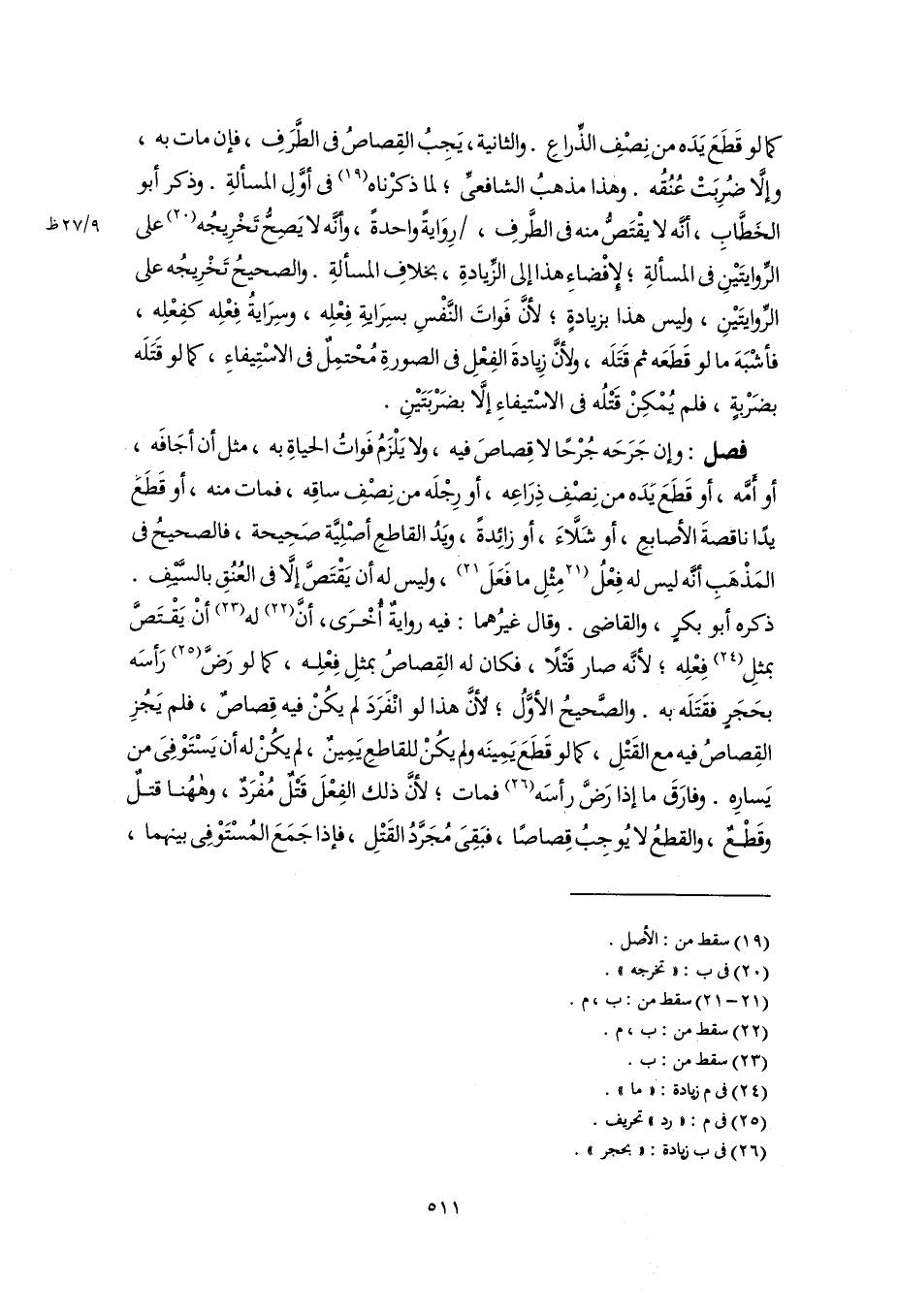 فصل: وإن جَرَحَه جُرْحًا لا قِصاصَ فيه، ولا يَلْزَمُ فَواتُ الحياةِ به، مثل أن أجَافَه، أو أَمَّه، أو قَطَعَ يَدَه من نِصْفِ ذِرَاعِه، أو رِجْلَه من نِصْفِ ساقِه، فمات منه، أو قَطَعَ يدًا ناقصةَ الأصابعِ، أو شَلَّاءَ، أو زائِدةً، ويَدُ القاطعِ أصْلِيَّة صَحِيحة، فالصحيحُ في المَذْهَبِ أنَّه ليس له فِعْلُ [مِثْلِ ما فَعَلَ] (٢١)، وليس له أن يَقْتَصَّ إلَّا في العُنُقِ بالسَّيْفِ. ذكره أبو بكرٍ، والقاضى. وقال غيرُهما: فيه روايةٌ أُخْرَى، أنَّ (٢٢) له (٢٣) أنْ يَقْتَصَّ بمثلِ (٢٤) فِعْلِه، لأنَّه صار قَتْلًا، فكان له القِصاصُ بمثلِ فِعْلِه، كما لو رَضَّ (٢٥) رَأسَه بحَجَرٍ فقَتَلَه به. والصَّحيحُ الأوَّلُ؛ لأنَّ هذا لو انْفَرَدَ لم يكُنْ فيه قِصاصٌ، فلم يَجُزِ القِصاصُ فيه مع القَتْلِ، كما لو قَطَعَ يَمِينَه ولم يكُنْ للقاطعِ يَمِينٌ، لم يكُنْ له أن يَسْتَوْفِىَ من يَسارِه. وفارَقَ ما إذا رَضَّ رأسَه (٢٦) فمات؛ لأنَّ ذلك الفِعْلَ قَتْلٌ مُفْرَدٌ، وههُنا قتلٌ وقَطْعٌ، والقطعُ لا يُوجِبُ قِصاصًا، فبَقِىَ مُجَرَّدُ القَتْلِ، فإذا جَمَعَ المُسْتَوْفِى بينهما،