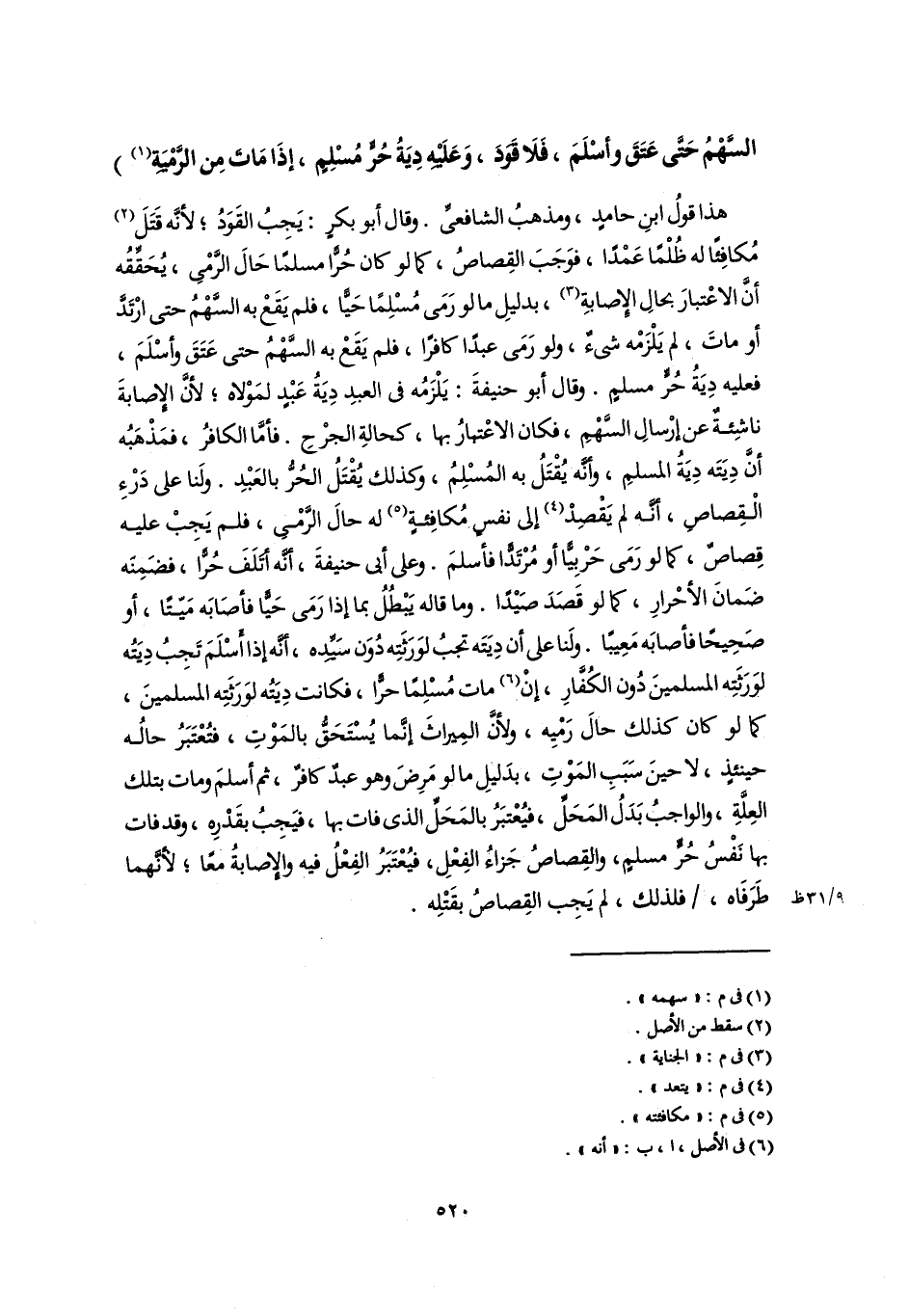 السَّهْمُ حَتَّى عَتَقَ وأسْلَمَ، فَلَا قَوَدَ، وَعَلَيْه دِيَةُ حُرٍّ مُسْلِمٍ، إذَا مَاتَ مِن الرَّمْيَةِ (١))