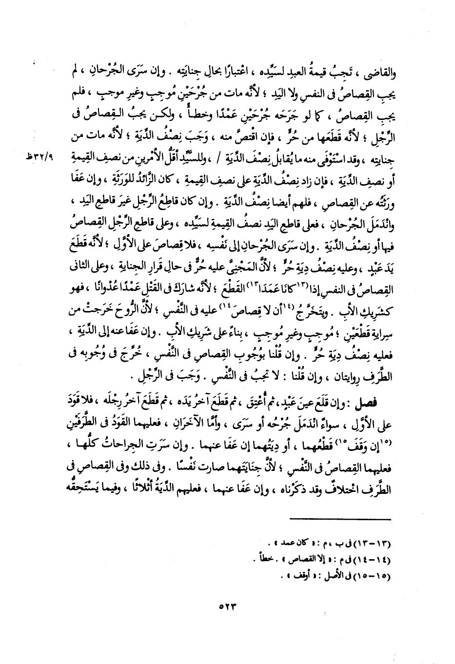 والقاضى، تَجِبُ قيمةُ العبدِ لسَيِّدِه، اعْتبارًا بحالِ جِنايَتِه. وإن سَرَى الجُرْحانِ، لم يجبِ القِصاصُ في النفسِ ولا اليَدِ؛ لأنَّه مات من جُرْحَيْنِ مُوجِبٍ وغيرِ موجبٍ، فلم يجبِ القِصاصُ، كما لو جَرَحَه جُرْحَيْنِ عَمْدًا وخطأً، ولكن يجبُ القِصاصُ في الرِّجْلِ؛ لأنَّه قَطَعَها من حُرٍّ، فإن اقْتصَّ منه، وَجَبَ نِصْفُ الدِّيَةِ؛ لأنَّه مات من جنايتِه، وقد اسْتَوْفَى منه ما يُقابلُ نِصْفَ الدِّيَةِ، وللسَّيِّدِ أقَلُّ الأمْرينِ من نصفِ القِيمةِ أو نصفِ الدِّيَةِ، فإن زاد نِصْفُ الدِّيَةِ على نصفِ القِيمةِ، كان الزَّائدُ للوَرَثَةِ، وإن عَفَا ورَثَتُه عن القِصاصِ، فلهم أيضًا نِصْفُ الدِّيَةِ. وان كان قاطِعُ الرِّجْلِ غيرَ قاطعِ اليَدِ، وانْدَمَلَ الجُرْحانِ، فعلى قاطعِ اليَدِ نصفُ القِيمةِ لسَيِّدِه، وعلى قاطعِ الرِّجْلِ القِصاصُ فيها أو نِصْفُ الدِّيَةِ. وإِن سَرَى الجُرْحانِ إلى نَفْسِه، فلا قِصاصَ على الأوَّلِ؛ لأنَّه قَطَعَ يَدَ عَبْدٍ، وعليه نِصْفُ دِيَةِ حُرٍّ؛ لأنَّ المَجْنِىَّ عليه حُرٌّ في حالِ قَرارِ الجِنايةِ، وعلى الثاني القِصاصُ في النفسِ إذا [كانَا عَمَدَا] (١٣) القَطْعَ؛ لأنَّه شارَكَ في القَتْلِ عَمْدًا عُدْوانًا، فهو كشَرِيكِ الأبِ. ويتَخَرَّجُ [أن لا قِصاصَ] (١٤) عليه في النَّفْسِ؛ لأنَّ الرُّوحَ خَرَجتْ من سِرايةِ قَطْعَيْنِ؛ مُوجِبٍ وغيرِ مُوجِبٍ، بِناءً على شَرِيكِ الأبِ. وإن عَفَا عنه إلى الدِّيَةِ، فعليه نِصْفُ دِيَةِ حُرٍّ. وان قُلْنا بوُجُوبِ القِصاصِ في النَّفْسِ، خُرِّجَ في وُجُوبِه في الطَّرَفِ رِوايتان، وان قُلْنا: لا تجبُ في النَّفْسِ. وَجَبَ في الرِّجْلِ.