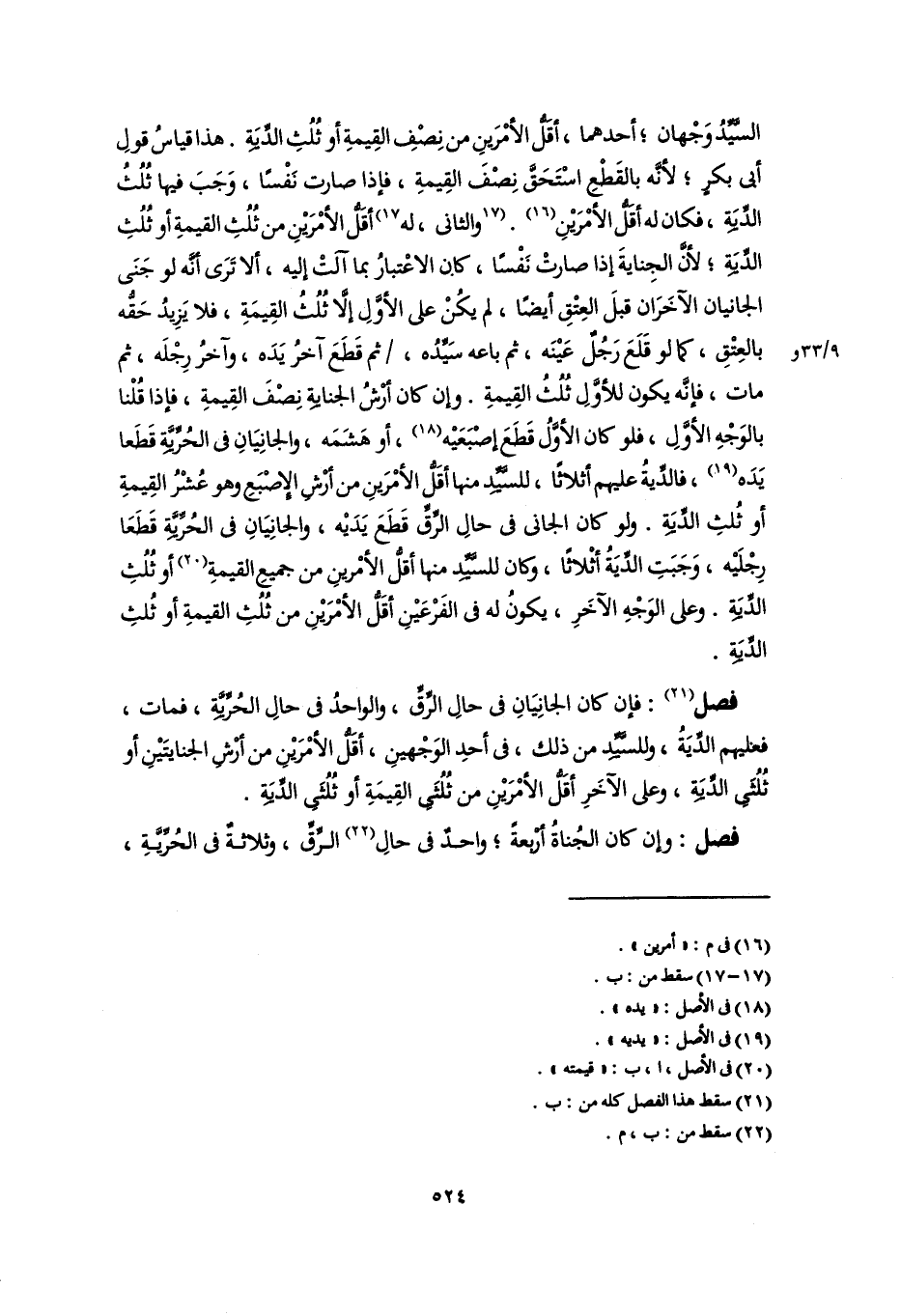 فصل (٢١): فإن كان الجانِيَانِ في حالِ الرِّقِّ، والواحدُ في حالِ الحُرِّيَّةِ، فمات، فعليهم الدِّيَةُ، وللسَّيِّدِ من ذلك، في أحدِ الوَجْهينِ، أقَلُّ الأمْرَيْنِ من أرْشِ الجنايتَيْنِ أو ثُلُثَيِ الدِّيَةِ، وعلى الآخَرِ أقَلُّ الأمْرَيْنِ من ثُلُثَيِ القِيمَةِ أو ثُلُثَيِ الدِّيَةِ.