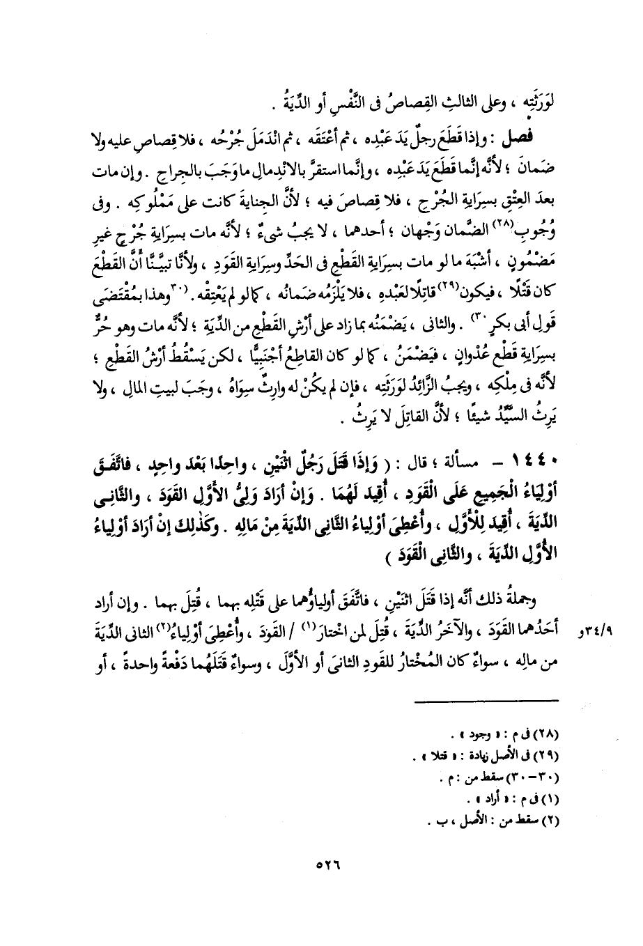 فصل: وإذا قَطَعَ رجلٌ يَدَ عَبْدِه، ثم أعْتَقَه، ثم انْدَمَلَ جُرْحُه، فلا قِصاص عليه ولا ضَمانَ؛ لأنَّه إنَّما قَطَعَ يَدَ عَبْدِه، وإنَّما استقرَّ بالانْدِمالِ ما وَجَبَ بالجِراحِ. وإن مات بعدَ العِتْقِ بسِرَايةِ الجُرْحِ، فلا قِصاصَ فيه؛ لأنَّ الجِنايةَ كانت على مَمْلُوكِه. وفى وُجُوبِ (٢٨) الضَّمان وَجْهان؛ أحدهما، لا يجبُ شيءٌ؛ لأنَّه مات بسِرَايةِ جُرْحٍ غيرِ مَضْمُونٍ، أشْبَهَ ما لو مات بسِرَايةِ القَطْعِ في الحَدِّ وسِرَايةِ القَوَدِ، ولأنَّا تبيَّنَّا أنَّ القَطْعَ كان قَتْلًا، فيكون (٢٩) قاتِلًا لعَبْدهِ، فلا يَلْزَمُه ضَمانُه، كما لو لم يَعْتِقْه. [وهذا بمُقْتَضَى قَولِ أبى بكرٍ] (٣٠). والثانى، يَضْمَنُه بما زاد على أرْشِ القَطْعِ من الدِّيَةِ؛ لأنَّه مات وهو حُرٌّ بسِرَايةِ قَطْع عُدْوانٍ، فيَضْمَنُ، كما لو كان القاطِعُ أجْنَبِيًّا، لكن يَسْقُطُ أرْشُ القَطْعِ؛ لأنَّه في مِلْكِه، ويجبُ الزَّائِدُ لوَرَثَتِه، فإن لم يكُنْ له وارِثٌ سِوَاهُ، وجَبَ لبيتِ المالِ، ولا يَرِثُ السَّيِّدُ شيئًا؛ لأنَّ القاتِلَ لا يَرِثُ.