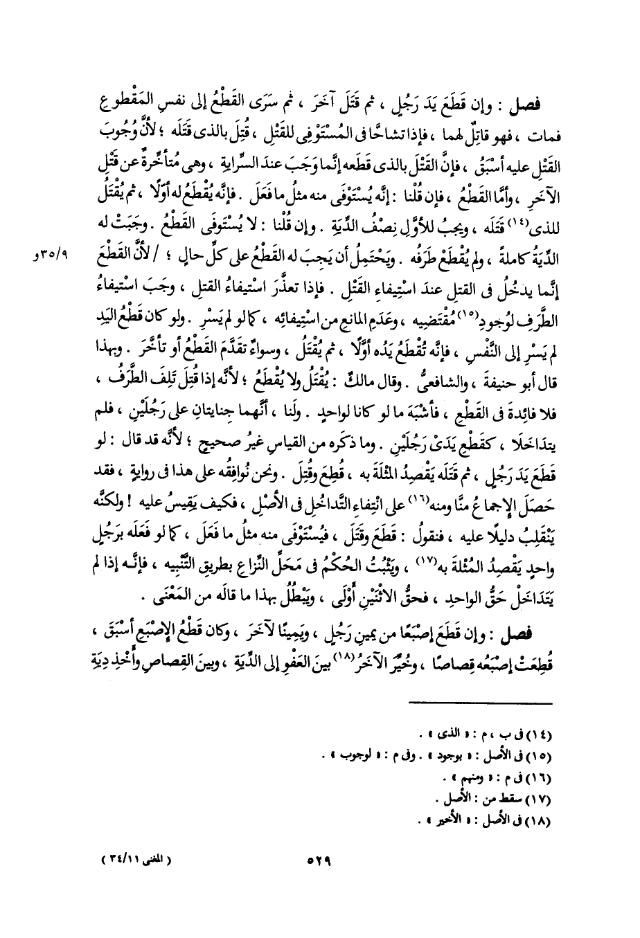فصل: وإن قَطَعَ يَدَ رَجُلٍ، ثم قَتَلَ آخَرَ، ثم سَرَى القَطْعُ إلى نفس المَقْطوعِ فمات، فهو قاتِلٌ لهما، فإذا تشاحَّا في المُسْتَوْفِى للقَتْلِ، قُتِلَ بالذى قَتَلَه؛ لأنَّ وُجُوبَ القَتْلِ عليه أسْبَقُ، فإنَّ القَتْلَ بالذى قَطَعه إنَّما وَجَبَ عندَ السِّرايةِ، وهى مُتأخِّرةٌ عن قَتْلِ الآخَرِ، وأمَّا القَطْعُ، فإن قُلْنا: إنَّه يُسْتَوْفَى منه مثلُ ما فَعَلَ. فإنَّه يُقْطَعُ له أوّلًا، ثم يُقْتَلُ للذى (١٤) قَتَلَه، ويجبُ للأوَّلِ نِصْفُ الدِّيَةِ. وإن قُلْنا: لا يُسْتَوفَى القَطْعُ. وجَبَتْ له الدِّيَةُ كاملةً، ولم يُقْطَعْ طَرَفُه. ويَحْتَمِلُ أن يَجِبَ له القَطْعُ على كلِّ حالٍ؛ لأنَّ القَطْعَ إنَّما يدخُلُ في القتلِ عندَ اسْتِيفاءِ القَتْلِ. فإذا تعذَّرَ اسْتيفاءُ القتلِ، وجَبَ اسْتيفاءُ الطَّرَفِ لوُجودِ (١٥) مُقْتَضِيه، وعَدَمِ المانعِ من اسْتِيفائِه، كما لو لم يَسْرِ. ولوكان قَطْعُ اليَدِ لم يَسْرِ إلى النَّفْسِ، فإنَّه تُقْطَعُ يَدُه أوَّلًا، ثم يُقْتَلُ، وسواءٌ تقَدَّمَ القَطْعُ أو تأخَّرَ. وبهذا قال أبو حنيفةَ، والشافعيُّ. وقال مالكٌ: يُقْتَلُ ولا يُقْطَعُ؛ لأنَّه إذا قُتِلَ تَلِفَ الطَّرَفُ، فلا فائِدةَ في القَطْعِ، فأشْبَهَ ما لو كانا لواحدٍ. ولَنا، أنَّهما جِنايتانِ على رَجُلَيْنِ، فلم يتدَاخَلَا، كقَطْعِ يَدَىْ رَجُلَيْنِ. وما ذكَره من القياسِ غيرُ صحيحٍ؛ لأنَّه قد قال: لو قَطَعَ يَدَ رَجُلٍ، ثم قَتَلَه يَقْصِدُ المثْلَةَ به، قُطِعَ وقُتِلَ. ونحن نُوافِقُه على هذا في روايةٍ، فقد حَصَلَ الإِجماعُ منَّا ومنه (١٦) على انْتِفاءِ التَّداخُلِ في الأصْلِ، فكيف يَقِيسُ عليه! ولكنَّه يَنْقَلِبُ دليلًا عليه، فنقولُ: قَطَعَ وقَتَلَ، فيُسْتَوْفَى منه مثلُ ما فَعَلَ، كما لو فَعَلَه برَجُلٍ واحدٍ يَقْصِدُ المُثْلةَ به (١٧)، ويَثْبُتُ الحُكْمُ في مَحَلِّ النِّزاعِ بطريقِ التَّنْبِيه، فإنَّه إذا لم يَتَدَاخَلْ حَقُّ الواحدِ، فحقُّ الاثْنَيْنِ أَوْلَى، ويَبْطُلُ بهذا ما قالَه من المَعْنَى.