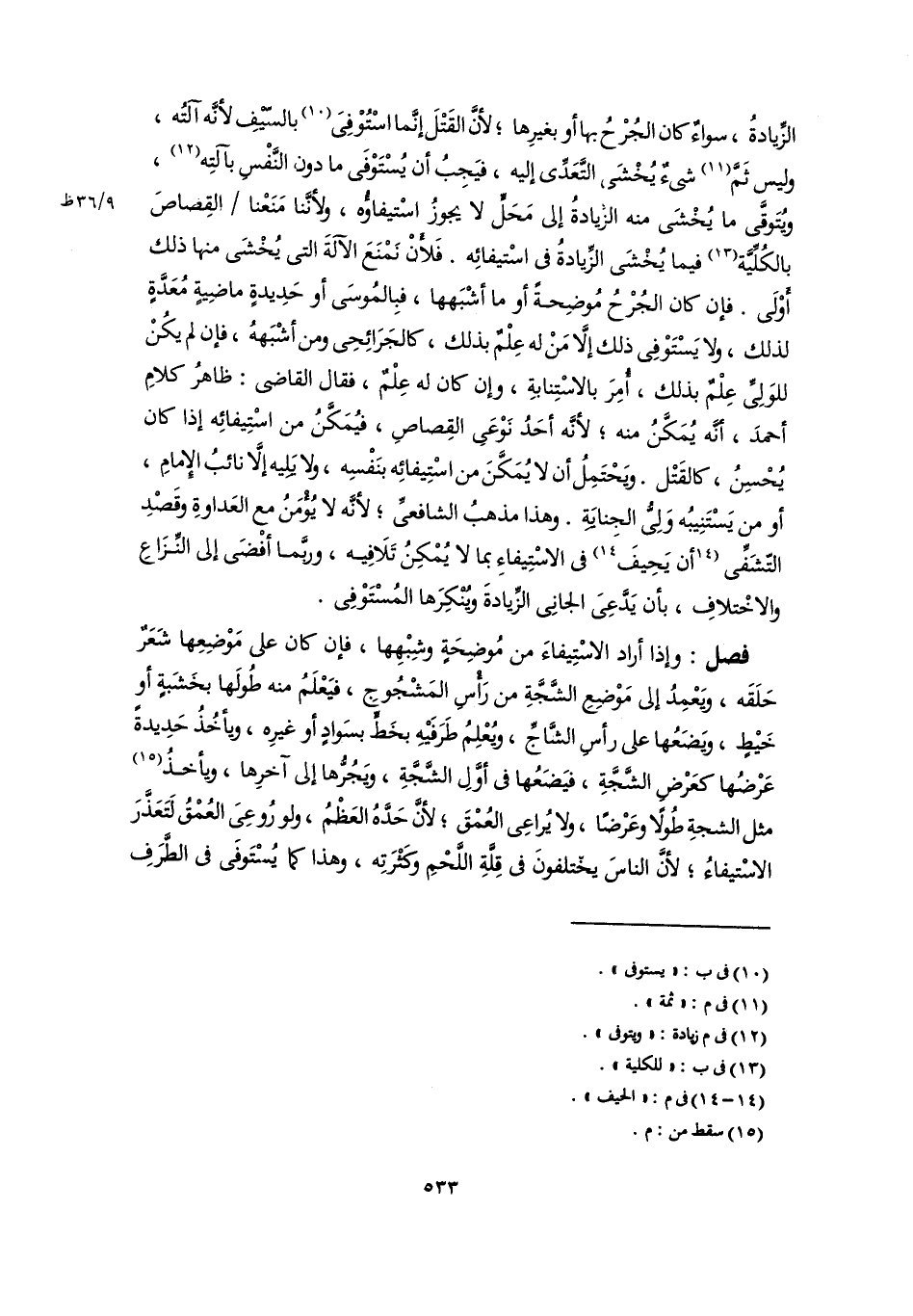 فصل: وإذا أراد الاسْتِيفاءَ من مُوضِحَةٍ وشِبْهِها، فإن كان على مَوْضِعِها شَعَرٌ حَلَقَه، ويَعْمِدُ إلى مَوْضِعِ الشَّجَّةِ من رَأْسِ المَشْجُوجِ، فيَعْلَمُ منه طُولَها بخَشَبةٍ أو خَيْطٍ، ويَضَعُها على رأسِ الشَّاجِّ، ويُعْلِمُ طَرَفَيْهِ بخَطٍّ بسَوادٍ أو غيرِه، ويأخُذُ حَدِيدةً عَرْضُها كعَرْضِ الشَّجَّةِ، فيَضَعُها في أوَّلِ الشَّجَّةِ، ويَجُرُّها إلى آخرِها، ويأخذُ (١٥) مثل الشجةِ طُولًا وعَرْضًا، ولا يُراعِى العُمْقَ؛ لأنَّ حَدَّهُ العَظْمُ، ولو رُوعِىَ العُمْقُ لَتَعَذَّرَ الاسْتيفاءُ؛ لأنَّ الناسَ يختلفونَ في قِلَّةِ اللَّحْمِ وكَثْرَتِه، وهذا كما يُسْتَوفَى في الطَّرَفِ