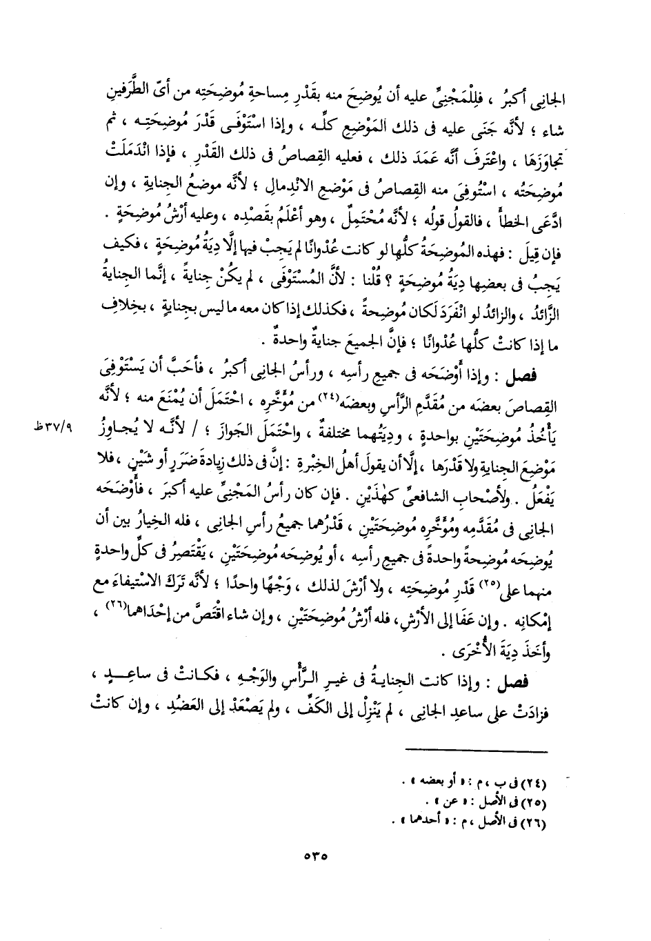 فصل: وإذا أَوْضَحَه في جميعِ رأسِه، ورأسُ الجانِى أكبرُ، فأحَبَّ أن يَسْتَوْفِىَ القِصاصَ بعضَه من مُقَدَّمِ الرَّأسِ وبعضَه (٢٤) من مُؤَخَّرِه، احْتَمَلَ أن يُمْنَعَ منه؛ لأنَّه يَأْخُذُ مُوضِحَتَيْنِ بواحدةٍ، ودِيَتُهما مختلفةٌ، واحْتَمَلَ الجَوازَ؛ لأنَّه لا يُجاوِزُ مَوْضِعَ الجِنايةِ ولا قَدْرَها، إلَّا أن يقولَ أهلُ الخِبْرةِ: إنَّ في ذلك زِيادةَ ضَرَرٍ أو شَيْنٍ، فلا يَفْعَلُ. ولأصْحابِ الشافعىِّ كهذَيْنِ. فإن كان رأسُ المَجْنِىِّ عليه أكبرَ، فأَوْضَحَه الجانِى في مُقَدَّمِه ومُؤَخَّرِه مُوضِحَتَيْنِ، قَدْرُهما جميعُ رأسِ الجانِى، فله الخِيارُ بين أن يُوضِحَه مُوضِحةً واحدةً في جميعِ رأسِه، أو يُوضِحَه مُوضِحَتَيْنِ، يَقْتَصِرُ في كلِّ واحدةٍ منهما على (٢٥) قَدْرِ مُوضِحَتِه، ولا أرْشَ لذلك، وَجْهًا واحدًا؛ لأَنَّه تَرَكَ الاسْتيفاءَ مع إمْكانِه. وإن عَفَا إلى الأرْشِ، فله أرْشُ مُوضِحَتَيْنِ، وإن شاء اقْتَصَّ من إحْدَاهما (٢٦)، وأخَذَ دِيَةَ الأُخْرَى.
