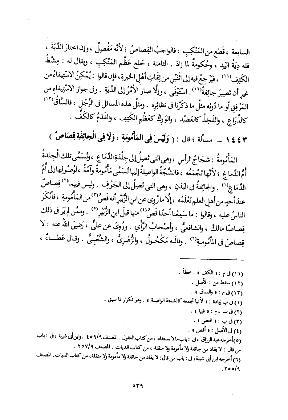 (٦) أخرجه ابن أبي شيبة، في باب من قال: لا يقاد من جائفة ولا مأمومة ولا منقلة، من كتاب الديات. المصنف ٩/ ٢٥٥.