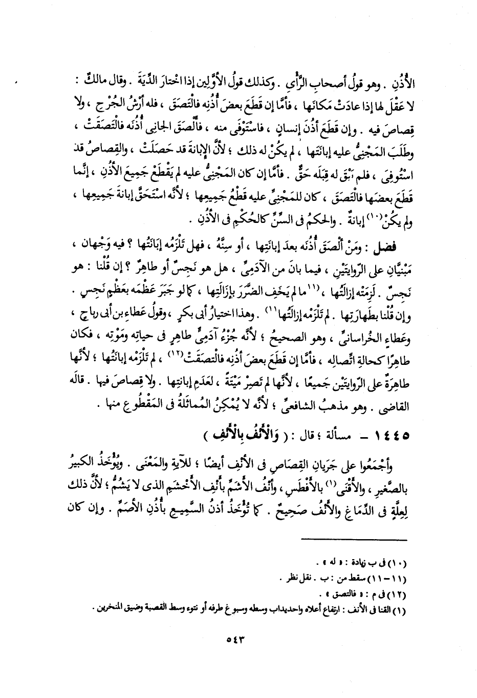 وأجْمَعُوا على جَرَيانِ القِصَاصِ في الأنْفِ أيضًا؛ للآيةِ والمَعْنَى. ويُؤْخَذُ الكبيرُ بالصَّغيرِ، والأَقْنَى (١) بالأَفْطَسِ، وأنْفُ الأَشَمِّ بأَنْفِ الأَخْشَمِ الذي لا يَشُمُّ؛ لأنَّ ذلك لِعِلَّةٍ في الدِّمَاغِ والأَنْفُ صَحِيحٌ. كما تُؤْخَذُ أذنُ السَّمِيعِ بأُذُنِ الأصَمِّ. وإن كان