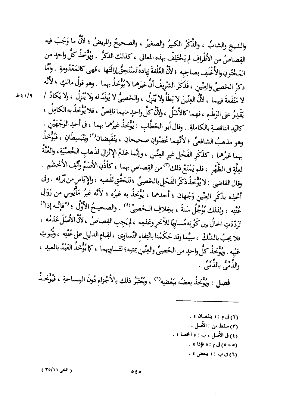 والشيخِ والشابِّ، والذَّكَرُ الكبيرُ والصغيرُ، والصحيحُ والمريضُ؛ لأنَّ ما وَجَبَ فيه القِصاصُ من الأطْرافِ لم يَخْتَلِفْ بهذه المعانى، كذلك الذكرُ. ويُؤْخَذُ كلُّ واحدٍ من المَخْتُونِ والأَغْلَفِ بصاحِبِه؛ لأنَّ الغُلْفةَ زِيادةٌ تَسْتَحِقُّ إزالَتَها، فهى كالمَعْدُومةِ. وأمَّا ذكرُ الخَصِىِّ والعِنِّينِ، فَذَكَرَ الشَّرِيفُ أنَّ غيرَهما لا يُؤْخَذُ بهما. وهو قولُ مالكٍ؛ لأنَّه لا مَنْفَعةَ فيهما، لأنَّ العِنِّينَ لا يَطَأُ ولا يُنْزِلُ، والخَصِىُّ لا يُولَدُ له ولا يُنْزِلُ، ولا يَكادُ يَقْدِرُ على الوَطْءِ، فهما كالأشَلِّ، ولأنَّ كلَّ واحدٍ منهما ناقِصٌ، فلا يُؤْخَذُ به الكامِلُ، كاليَدِ الناقصةِ بالكاملةِ. وقال أبو الخَطَّابِ: يُؤْخَذُ غيرُهما بهما، في أحدِ الوَجْهَيْنِ. وهو مذهبُ الشافعىِّ؛ لأنَّهما عُضْوانِ صحيحانِ، ينْقَبِضان (٢) ويَنْبَسِطَانِ، فيُؤْخَذُ بهما غيرُهما، كذَكَرِ الفَحْلِ غيرِ العِنِّينِ، وإنَّما عَدَمُ الإِنْزالِ لذَهابِ الخُصْيَةِ، والعُنَّةُ لعِلَّةٍ في الظَّهْرِ، فلم يَمْنَعْ ذلك (٣) من القِصاصِ بهما، كأذُنِ الأصَمِّ وأنْفِ الأخْشَمِ. وقال القاضي: لا يُؤْخَذُ ذكَرُ الفَحْلِ بالخَصِىِّ؛ لتَحَقُّقِ نَقْصِه، والإِيَاسِ من بُرْئِه. وفى أخْذِه بذَكَرِ العِنِّينِ وَجْهان؛ أحدهما، يُؤْخَذُ به غيرُه؛ لأنَّه غيرُ مَأْيُوسٍ من زَوَالِ عُنَّتِه، ولذلك يُؤَجَّلُ سَنةً، بخِلافِ الخَصِىِّ (٤). والصحيحُ الأوَّلُ؛ [فإنَّه إذا] (٥) تَرَدّدَتِ الحالُ بين كَوْنِه مُساوِيًا للآخَرِ وعَدَمِه، لم يَجِبِ القِصاصُ، لأنَّ الأصْلَ عَدَمُه، فلا يجبُ بالشَّكِّ، سِيَّما وقد حَكَمْنا بانْتِفاءِ التَّساوِى، لقِيامِ الدليلِ على عُنَّتِه، وثُبُوتِ عَيْبه. ويُؤْخَذُ كلُّ واحدٍ من الخَصِىِّ والعِنِّينِ بمثلِه؛ لتَساوِيهما، كما يُؤْخَذُ العَبْدُ بالعبدِ، والذِّمِّىُّ بالذِّمِّىِّ.