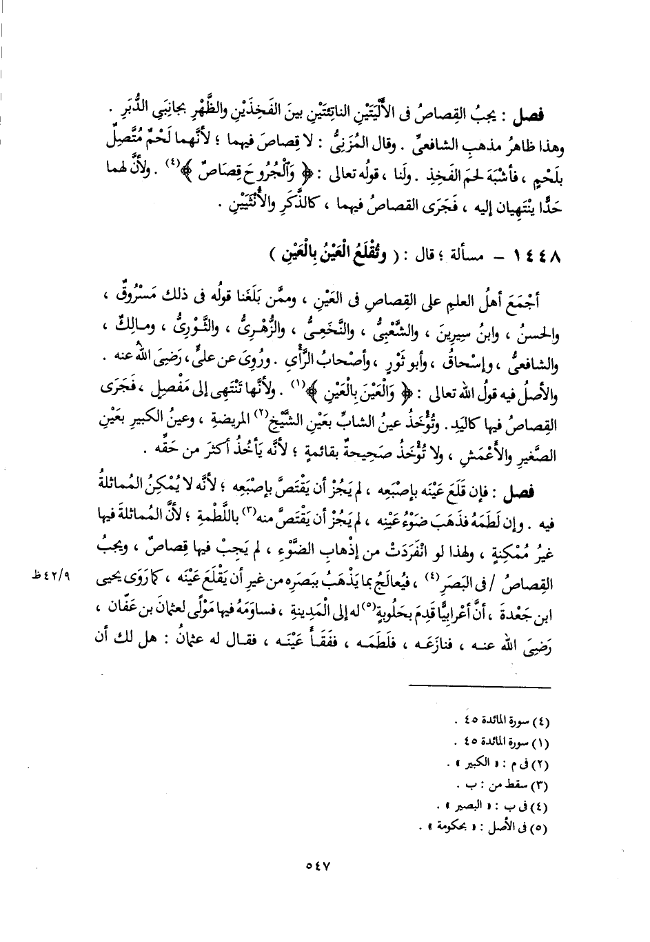 أجْمَعَ أهلُ العلمِ على القِصاصِ في العَيْنِ، وممَّن بَلَغَنا قولُه في ذلك مَسْرُوقٌ، والحسنُ، وابنُ سِيرِينَ، والشَّعْبِىُّ، والنَّخَعِىُّ، والزُّهْرِيُّ، والثَّوْرِيُّ، ومالِكٌ، والشافعيُّ، وإسْحاقُ، وأبو ثَوْرٍ، وأصْحابُ الرَّأْىِ. ورُوِىَ عن عليٍّ، رَضِىَ اللهُ عنه. والأصلُ فيه قولُ اللَّه تعالى: {وَالْعَيْنَ بِالْعَيْنِ} (١). ولأنَّها تَنْتَهِى إلى مَفْصِلٍ، فَجَرَى القِصاصُ فيها كاليَدِ. وتُؤْخَذُ عينُ الشابِّ بعَيْنِ الشَّيْخِ (٢) المريضةِ، وعينُ الكبيرِ بعَيْنِ الصَّغيرِ والأَعْمَشِ، ولا تُؤْخَذُ صَحِيحةٌ بقائمةٍ؛ لأنَّه يَأخُذُ أكثرَ من حَقِّه.