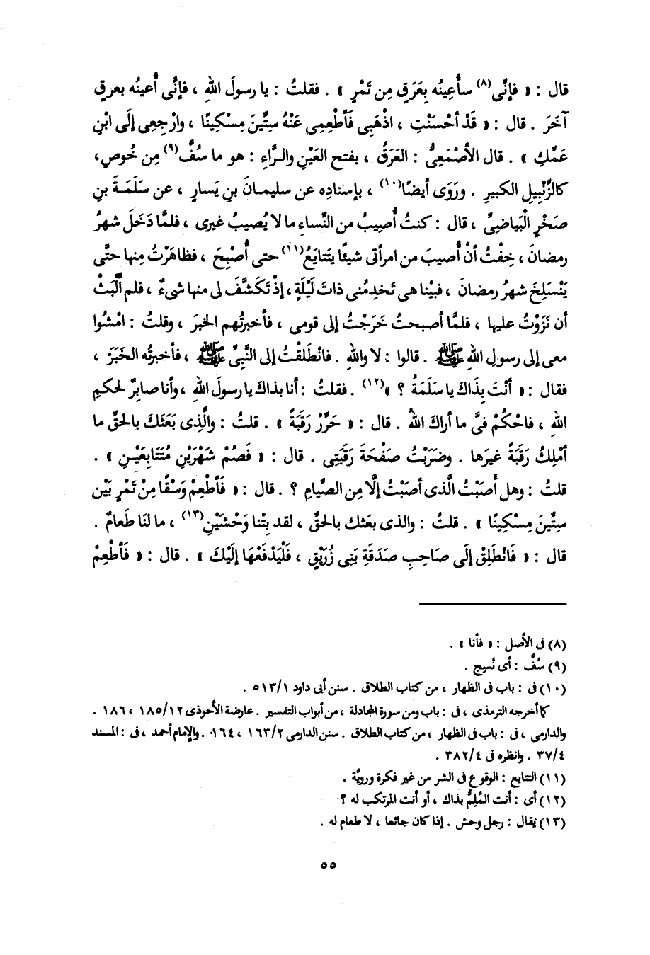قال: "فإنِّى (٨) سأُعِينُه بِعَرَقٍ مِن تَمْرٍ". فقلتُ: يا رسولَ اللَّهِ، فإنِّى أُعينُه بعرقٍ آخَرَ. قال: "قَدْ أحْسَنْتِ، اذْهَبِى فَأطْعِمِى عَنْهُ سِتِّينَ مِسْكِينًا، وارْجِعِى إلَى ابْنِ عَمِّكِ". قال الأصْمَعِىُّ: العَرَقُ، بفتح العَيْنِ والرَّاءِ: هو ما سُفَّ (٩) مِن خُوصٍ، كالزِّنْبِيلِ الكبيرِ. ورَوَى أيضًا (١٠)، بإسنادِه عن سليمانَ بن يَسارٍ، عن سَلَمَةَ بنِ صَخْرٍ الْبَياضِىِّ، قال: كنتُ أُصِيبُ من النِّساءِ ما لا يُصيبُ غيرى، فلمَّا دَخَلَ شهرُ رمضانَ، خِفْتُ أَنْ أُصيبَ من امرأتى شيئًا يتَتايَعُ (١١) حتى أُصْبِحَ، فظاهَرْتُ مِنها حتَّى يَنْسَلِخَ شهرُ رمضانَ، فبيْنا هى تَخدِمُنى ذاتَ لَيْلَةٍ، إذْ تَكَشَّفَ لى منها شىءٌ، فلم أَلْبَثْ أن نَزَوْتُ عليها، فلمَّا أصبحتُ خَرَجْتُ إلى قومى، فأخبرتُهم الخبرَ، وقلتُ: امْشُوا معى إلى رسولِ اللَّهِ -صلى اللَّه عليه وسلم-. قالوا: لا واللَّهِ. فانْطَلقْتُ إلى النَّبِىِّ -صلى اللَّه عليه وسلم-، فأخبرتُه الخَبَرَ, فقال: "أَنْتَ بِذَاكَ يا سَلَمَةُ؟ " (١٢). فقلتُ: أنا بذاكَ يا رسولَ اللَّهِ، وأنا صابِرٌ لحكمِ اللَّهِ، فاحْكُمْ فىَّ ما أراكَ اللَّهُ. قال: "حَرِّرْ رَقَبَةً". قلتُ: والَّذِى بَعَثَكَ بالحقِّ ما أمْلِكُ رَقَبَةً غيرَها. وضَرَبْتُ صَفْحَةَ رَقَبَتِى. قال: "فَصُمْ شَهْرَيْنِ مُتَتَابِعَيْنِ". قلتُ: وهل أَصَبْتُ الَّذى أصَبْتُ إلَّا مِن الصِّيامِ؟ . قال: "فَأطْعِمْ وَسْقًا مِنْ تَمْرٍ بَيْن سِتِّينَ مِسْكِينًا". قلتُ: والذى بعَثك بالحقِّ، لقد بِتْنا وَحْشَيْنِ (١٣)، ما لنَا طَعامٌ. قال: "فَانْطَلِقْ إلَى صَاحِبِ صَدَقَةِ بَنِى زُرَيْقٍ، فَلْيَدْفَعْهَا إلَيْكَ". قال: "فَأطْعِمْ