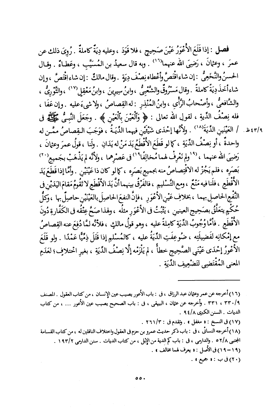 (١٦) أخرجه عن عمر وعثمان عبد الرزاق، في: باب الأعور يصيب عين الإِنسان، من كتاب العقول. المصنف ٩/ ٣٣٠، ٣٣١. وأخرجه عن عثمان، البيهقي، في: باب الصحيح يصيب عين الأعور. . ., من كتاب الديات. السنن الكبرى ٨/ ٩٤.