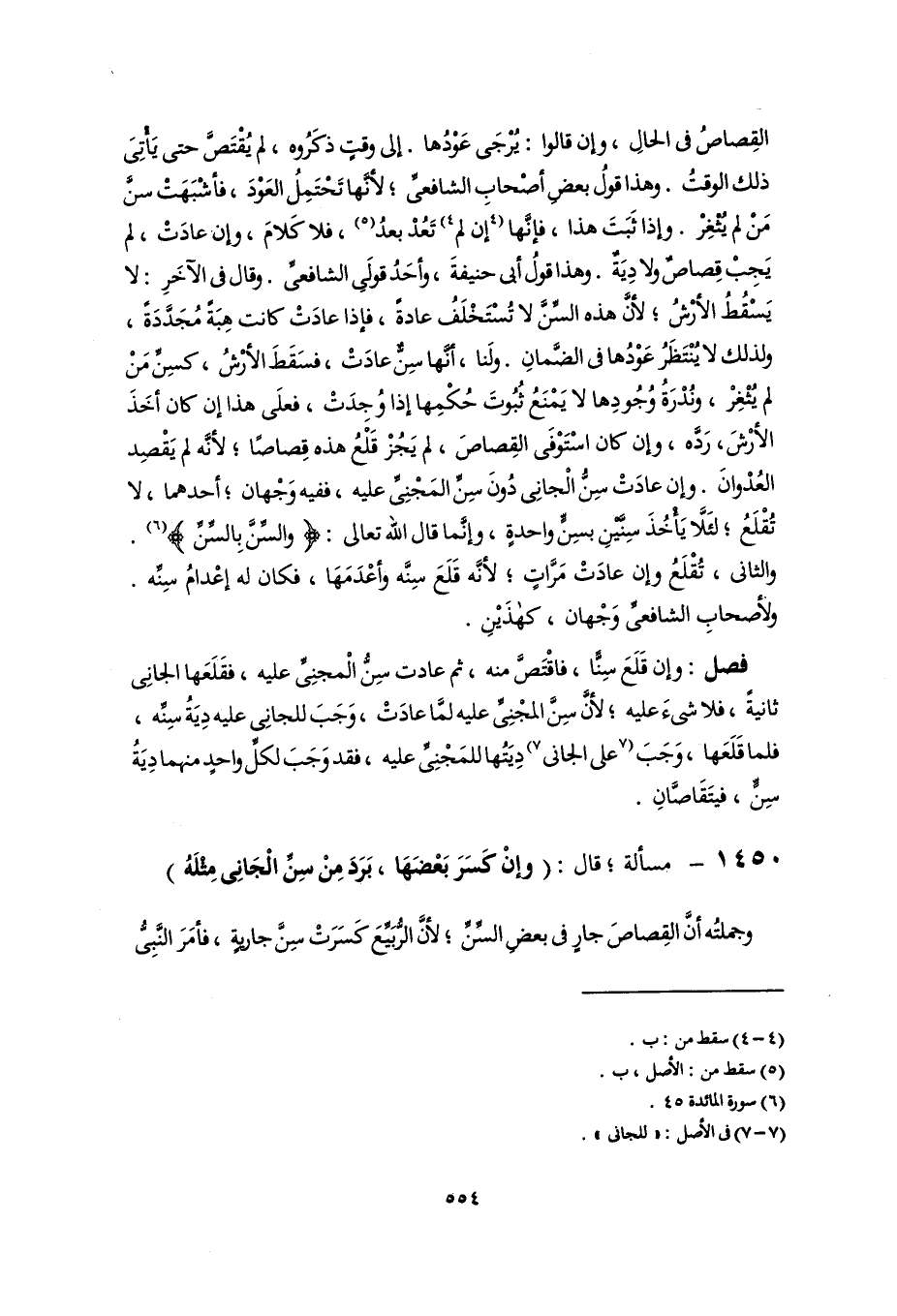 القِصاصُ في الحالِ، وإن قالوا: يُرْجَى عَوْدُها. إلى وقتٍ ذكَرُوه، لم يُقْتَصَّ حتى يَأْتِىَ ذلك الوقتُ. وهذا قولُ بعضِ أصْحابِ الشافعىِّ؛ لأنَّها تَحْتَمِلُ العَوْدَ، فأشْبَهَتْ سنَّ مَنْ لم يُثْغِرْ. وإذا ثَبَتَ هذا، فإنَّها [إن لم] (٤) تَعُدْ بعدُ (٥)، فلا كَلامَ، وإن عادَتْ، لم يَجِبْ قِصاصٌ ولا دِيَةٌ. وهذا قولُ أبى حنيفةَ، وأحَدُ قولَىِ الشافعىِّ. وقال في الآخَرِ: لا يَسْقُطُ الأرْشُ؛ لأنَّ هذه السِّنَّ لا تُسْتَخْلَفُ عادةً، فإذا عادَتْ كانت هِبَةً مُجَدَّدَةً، ولذلك لا يُنْتَظَرُ عَوْدُها في الضَّمانِ. ولَنا، أنَّها سِنٌّ عادَتْ، فسَقَطَ الأرْشُ، كسِنِّ مَنْ لم يُثْغِرْ، ونُدْرَةُ وُجُودِها لا يَمْنَعُ ثُبُوتَ حُكْمِها إذا وُجِدَتْ، فعلَى هذا إن كان أخَذَ الأرْشَ، رَدَّه، وإن كان اسْتَوْفَى القِصاصَ، لم يَجُزْ قَلْعُ هذه قِصاصًا؛ لأنَّه لم يَقْصِد العُدْوانَ. وإن عادَتْ سِنُّ الْجانِى دُونَ سِنِّ المَجْنِىِّ عليه، ففيه وَجْهان؛ أحدهما، لا تُقْلَعُ؛ لئَلَّا يَأْخُذَ سِنَّيْنِ بسِنٍّ واحدةٍ، وإنَّما قال اللَّه تعالى: {وَالسِّنَّ بِالسِّنِّ} (٦). والثانى، تُقْلَعُ وإن عادَتْ مَرَّاتٍ؛ لأنَّه قَلَعَ سِنَّه وأعْدَمَهَا، فكان له إعْدامُ سِنِّه. ولأصحابِ الشافعىِّ وَجْهان، كهذَيْنِ.