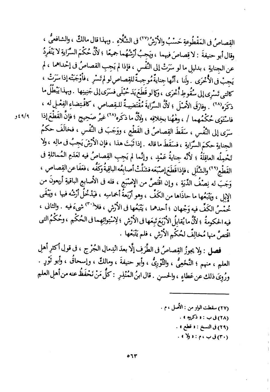 القِصاصُ في المَقْطُوعةِ حَسْبُ والأرْشُ (٢٧) في الشَّلَّاءِ. وبهذا قال مالكٌ، والشافعيُّ، وقال أبو حنيفةَ: لا قِصاصَ فيهما، ويَجِبُ أرْشُهُما جميعًا؛ لأنَّ حُكْمَ السِّرَايةِ لا يَنْفَرِدُ عن الجِنايةِ، بدليلِ ما لو سَرَتْ إلى النَّفْسِ، فإذا لم يَجِبِ القصاصُ في إحْداهما، لم يَجِبْ في الأُخْرَى. ولَنا، أنَّها جِنايةٌ مُوجِبةٌ للقِصاصِ لو لم تَسْرِ، فأوْجَبَتْه إذا سَرَتْ، كالتى تَسْرِى إلى سُقُوطِ أُخْرَى، وكما لو قَطَعَ يَدَ حُبْلَى فسَرَى إلى جَنِينِها. وبهذا يَبْطُلُ ما ذكَرَه (٢٨). وفارَقَ الأصْلَ؛ لأنَّ السِّرَايةَ مُقْتَضِيةٌ للقِصاصِ، كاقْتِضاءِ الفِعْلِ له، فاسْتَوَى حُكْمُهما، وههُنا بخِلافِه، ولأنَّ ما ذكَره (٢٨) غيرُ صَحِيحٍ؛ فإنَّ القَطْعَ إذا سَرَى إلى النَّفْسِ، سَقَطَ القِصاصُ في القَطْعِ، ووَجَبَ في النَّفْسِ، فخالَفَ حكمُ الجِنايةِ حكمَ السِّرَايةِ، فسَقَطَ ما قاله. إذا ثَبَتَ هذا، فإن الأرْشَ يَجِبُ في مالِه، ولا تَحْمِلُه العاقِلَةُ؛ لأنَّه جِنايةُ عَمْدٍ، وإنَّما لم يَجِبِ القِصاصُ فيه لعَدَمِ المُماثلةِ في القَطْعِ (٢٩) والشَّلَلِ، فإذا قَطَعَ إصْبَعَه فشَلَّتْ أصابِعُه الباقِيةُ وكَفُّه، فعَفَا عن القِصاصِ، وَجَبَ له نِصْفُ الدِّيَةِ، وإن اقْتَصَّ من الإِصْبَعِ، فله في الأصابعِ الباقيةِ أربعونَ من الإِبِلِ، ويَتْبَعُها ما حاذَاها من الكَفِّ، وهو أرْبَعةُ أخماسِه، فيَدْخُلُ أرْشُه فيها، ويَبْقَى خُمْسُ الكَفِّ فيه وَجْهان؛ أحدهما، يَتْبَعُها في الأرْشِ، فلا (٣٠) شىءَ فيه. والثانى، فيه الحكومةُ؛ لأنَّ ما يُقابِلُ الأرْبَعَ تَبِعَها في الأرْشِ؛ لِاسْتِوائِهِما في الحُكْمِ، وحُكْمُ التي اقْتصَّ منها مُخالِفٌ لحُكْمِ الأرْشِ، فلم يَتْبَعْها.