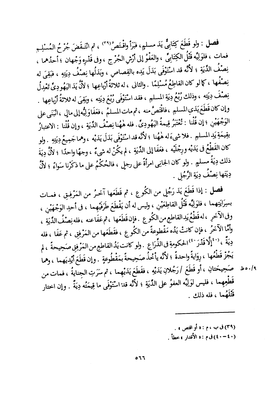 فصل: ولو قَطَعَ كِتَابِىٌّ يَدَ مسلمٍ، فبَرَأ واقْتَصَّ (٣٩)، ثم انْتَقَضَ جُرْحُ المُسْلِمِ فمات، فلوَلِيِّه قَتْلُ الكِتَابِىِّ، والعَفْوُ إلى أرْشِ الجُرْحِ، وفى قَدْرِه وَجْهان؛ أحدُهما، نِصْفُ الدِّيَةِ؛ لأنَّه قد اسْتَوْفَى بَدَلَ يَدِه بالقِصاصِ، وبَدَلُها نِصْفُ دِيَتِهِ، فبَقِىَ له نِصْفُها، كما لو كان القاطِعُ مُسْلِمًا. والثانى، له ثلاثةُ أرْباعِها؛ لأنَّ يَدَ اليَهُودِىِّ تَعْدِلُ نِصْفَ دِيَتِه، وذلك رُبْعُ دِيَةِ المسلمِ، فقد اسْتَوْفَى رُبْعَ دِيَتِه، وبَقِىَ له ثلاثةُ أرْباعِها. وإن كان قَطَعَ يَدَىِ المسلمِ، فاقْتَصَّ منه، ثم مات المسلمُ، فعَفَا وَلِيُّه إلى مالٍ، انْبَنَى على الوَجْهَيْنِ؛ إن قُلْنا: تُعْتَبَرُ قِيمةُ اليَهُودِىِّ. فله ههُنا نِصْفُ الدِّيَةِ، وإن قُلْنا: الاعتبارُ بقِيمَةِ يَدِ المسلمِ. فلا شىءَ له ههُنا؛ لأنَّه قد اسْتَوْفَى بَدَلَ يَدَيْه، وهما جَمِيعُ دِيَتِهِ. ولو كان القَطْعُ في يَدَيْه ورِجْلَيْه، فعَفَا إلى الدِّيَةِ، لم يكُنْ له شيءٌ، وجهًا واحدًا؛ لأنَّ دِيَةَ ذلك دِيَةُ مسلمٍ. ولو كان الجانِى امرأةً على رجلٍ، فالحُكْمُ على ما ذكَرْنا سَواءً؛ لأنَّ دِيَتَها نِصْفُ دِيَةِ الرَّجُلِ.