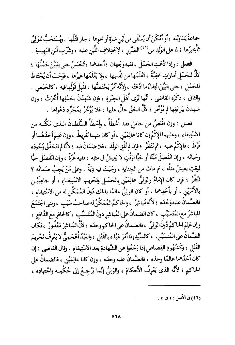 فصل: وإن اقْتَصَّ من حاملٍ فقد أَخْطَأَ، وأخْطَأَ السُّلْطانُ الذي مَكَّنَه من الاسْتِيفاءِ، وعليهما الإِثْمُ إن كانا عالِمَيْنِ، أو كان منهما تَفْرِيطٌ، وإن عَلِمَ أحَدُهُما أو فَرَّطَ، فالإِثْمُ عليه، ثم نَنْظُرُ؛ فإن لم تُلْقِ الولَدَ، فلا ضَمَانَ فيه؛ لأنَّا لم نَتَحَقَّقْ وُجُودَه وحَياتَه، وإن انْفَصَلَ مَيِّتًا أو حَيًّا لوَقْتٍ لا يَعِيشُ في مثلِه، ففيه غُرّةٌ، وإن انْفَصَلَ حيًّا لوقتٍ يعيشُ مثلُه، ثم ماتَ من الجِنايةِ، وجَبَتْ فيه دِيَةٌ. وعلى مَنْ يَجِبُ ضَمانُه؟ نَنْظُرُ؛ فإن كان الإِمامُ والوَلِىُّ عالِمَيْنِ بِالحَمْلِ وتَحْريمِ الاسْتِيفاءِ، أو جاهِلَيْنِ بالأمْرَيْنِ، أو بأحَدِهما، أو كان الولِىُّ عالمًا بذلك دُونَ المُمَكِّنِ له من الاسْتيفاءِ، فالضَّمانُ عليه وَحْدَه؛ لأنَّه مُباشِرٌ، والحاكمُ المُمَكِّنُ له صاحبُ سَبَبٍ، ومتى اجْتَمَعَ المباشرُ مع المُتَسَبِّبِ، كان الضمانُ على المُباشِرِ دونَ المُتَسَبِّبِ، كالحافرِ مع الدَّافعِ، وإن عَلِمَ الحاكمُ دُونَ الوَلِىِّ، فالضمانُ على الحاكمِ وحدَه؛ لأنَّ المُباشِرَ مَعْذُورٌ، فكان الضَّمانُ على المُتسَبِّبِ، كالسَّيِّدِ إذا أمَرَ عَبْدَه بالقَتْلِ، والعَبْدُ أَعْجَمِىٌّ لا يَعْرِفُ تَحْريمَ القَتْلِ، وكَشُهُودِ القِصاصِ إذا رَجَعُوا عن الشَّهادةِ بعد الاسْتِيفاءِ. وقال القاضي: إن كان أحَدُهما عالمًا وحدَه، فالضَّمانُ عليه وحدَه، وإن كانا عالِمَيْنِ، فالضمانُ على الحاكمِ؛ لأنَّه الذي يَعْرِفُ الأحكامَ، والوَلِىُّ إنَّما يَرْجِعُ إلى حُكْمِه واجْتهادِه،