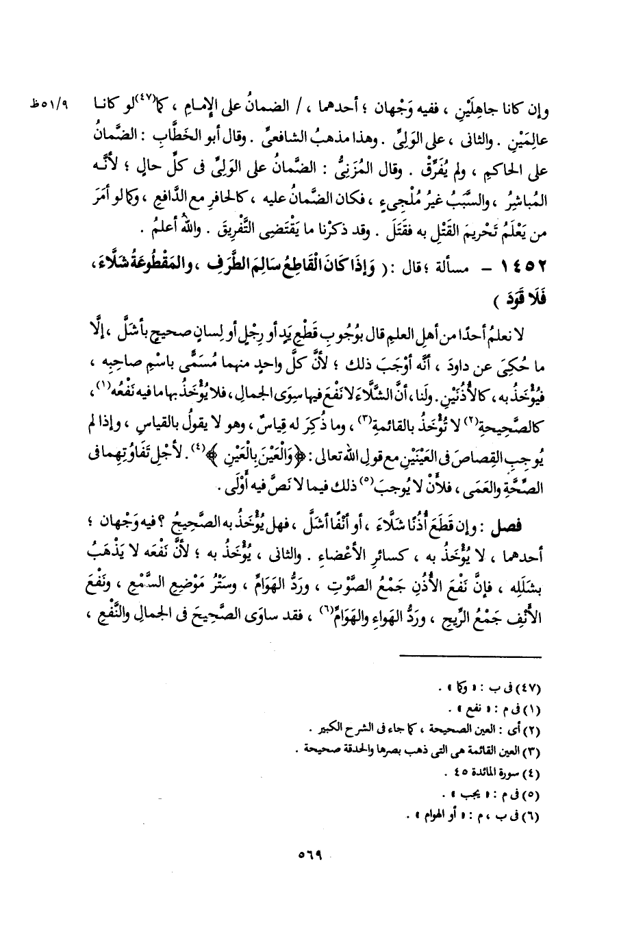 فصل: وإن قَطَعَ أُذُنًا شَلَّاءَ، أو أنْفًا أشَلَّ، فهل يُؤْخَذُ به الصَّحِيحُ؟ فيه وَجْهان؛ أحدهما، لا يُؤْخَذُ به، كسائرِ الأعْضاءِ. والثانى، يُؤْخَذُ به؛ لأنَّ نَفْعَه لا يَذْهَبُ بشَلَلِه، فإنَّ نَفْعَ الأُذُنِ جَمْعُ الصَّوْتِ، ورَدُّ الهَوَامِّ، وسَتْرُ مَوْضِعِ السَّمْعِ، ونَفْعَ الأَنْفِ جَمْعُ الرِّيحِ، ورَدُّ الهَواءِ والهَوَامِّ (٦)، فقد ساوَى الصَّحِيحَ في الجمالِ والنَّفْعِ،