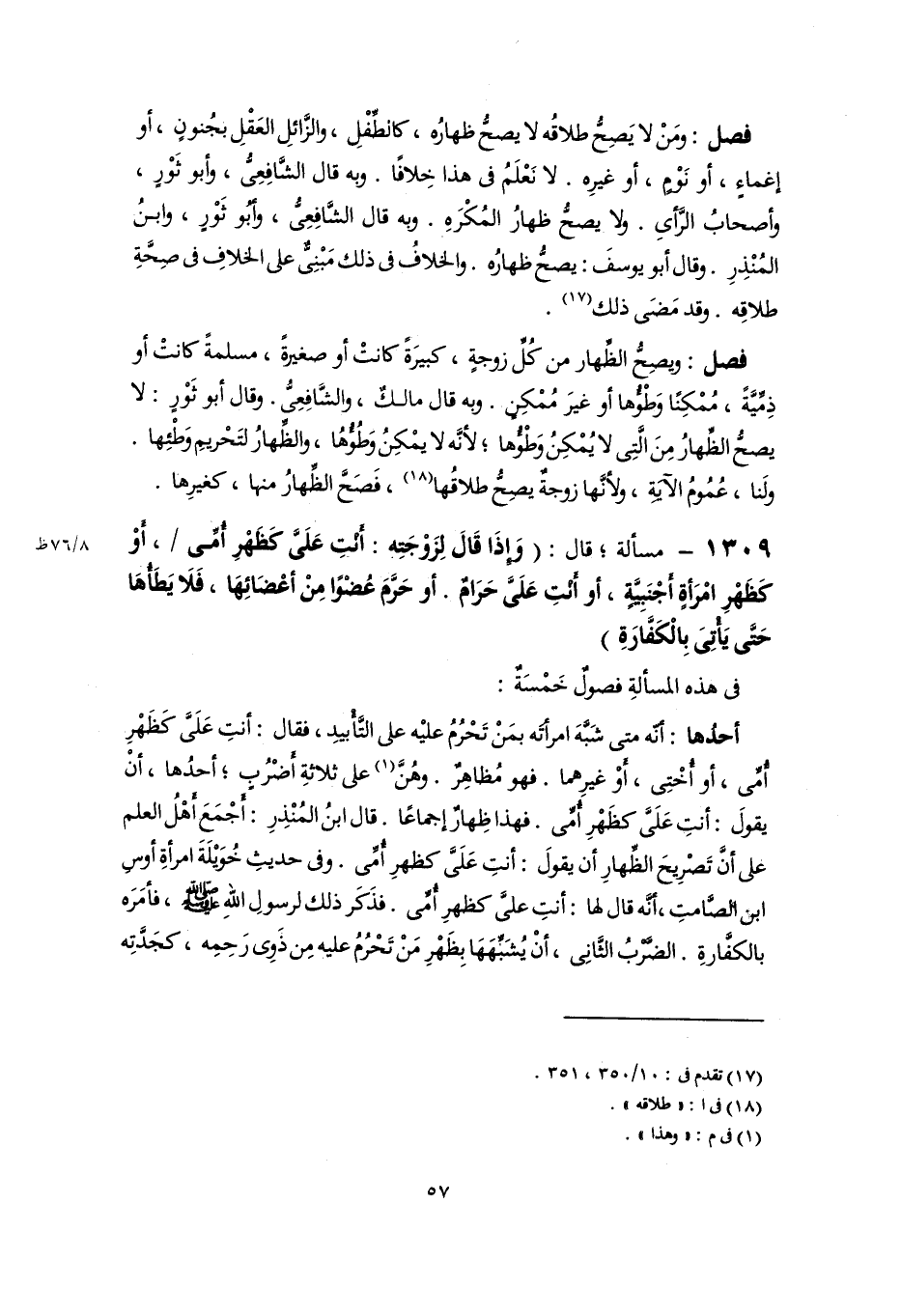 أحدُها: أنّه متى شَبَّهَ امرأتَه بمَنْ تَحْرُمُ عليْه على التَّأْبيدِ، فقال: أنتِ عَلَىَّ كَظَهْرِ أُمِّى، أو أُخْتِى، أَوْ غيرِهما. فهو مُظاهِرٌ. وهُنَّ (١) على ثلاثةِ أَضْرُبٍ؛ أحدُها، أَنْ يقولَ: أنتِ عَلَىَّ كظَهْرِ أُمِّى. فهذا ظِهارٌ إجماعًا. قال ابنُ المُنْذِرِ: أَجْمَعَ أَهْلُ العلم على أَنَّ تَصْرِيحَ الظِّهارِ أن يقولَ: أنتِ عَلَىَّ كظهرِ أُمِّى. وفى حديثِ خُوَيْلَةَ امرأةِ أوسِ ابن الصَّامتِ، أنَّه قال لها: أنتِ علىَّ كظهرِ أُمِّى. فذَكَر ذلك لرسولِ اللَّهِ -صلى اللَّه عليه وسلم-، فأمَرَه بالكفَّارةِ. الضَّرْبُ الثَّانِى، أَنْ يُشَبِّهَهَا بِظَهْرِ مَنْ تَحْرُمُ عليه مِن ذَوِى رَحِمِه، كجَدَّتِه