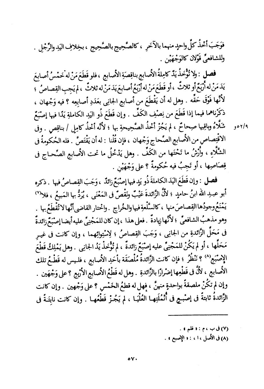 فصل: وإن قَطَعَ اليَدَ الكاملةَ ذُو يَدٍ فيها إصْبَعٌ زائدٌ، وَجَبَ القِصاصُ فيها. ذكره أبو عبدِ اللَّه ابنُ حامدٍ؛ لأنَّ الزَّائدةَ عَيْبٌ ونَقْصٌ في المَعْنَى، يُرَدُّ بها المَبيعُ، فلا (٧) يَمْنَعُ وجودُها القِصاصَ منها، كالسَّلْعةِ فيها والخُراجِ. واخْتار القاضي أنَّها لا تُقْطَعُ بها. وهو مذهبُ الشافعىِّ؛ لأنَّها زِيادةٌ. فعلى هذا، إن كان للمَجْنِىِّ عليه أيضًا إصْبَعٌ زائدةٌ في مَحَلِّ الزَّائدةِ من الجانِى، وَجَبَ القِصاصُ؛ لِاسْتِوائِهما، وإن كانت في غيرِ مَحَلِّها، أو لم يَكُنْ للمَجْنِىِّ عليه إصْبَعٌ زائدةٌ، لم تُؤْخَذْ يَدُ الجانِى. وهل يَمْلِكُ قَطْعَ الإِصْبَعِ (٨)؟ نَنْظُرُ؛ فإن كانت الزَّائدةُ مُلْصَقَة بأحَدِ الأصابعِ، فليس له قَطْعُ تلك الأصابعِ، لأنَّ في قَطْعِها إضْرارًا بالزَّائدةِ. وهل له قَطْعُ الأصابعِ الأرْبعِ؟ على وَجْهَين. وإن لم تكُنْ ملصقةً بواحدةٍ منهنَّ، فهل له قطعُ الخَمْسِ؟ على وَجْهين. وإن كانت الزَّائدةُ ثابتةً في إصْبعٍ في أُنْمُلَتِها العُلْيَا، لم يَجُزْ قَطْعُها. وإن كانت نابِتَةً في