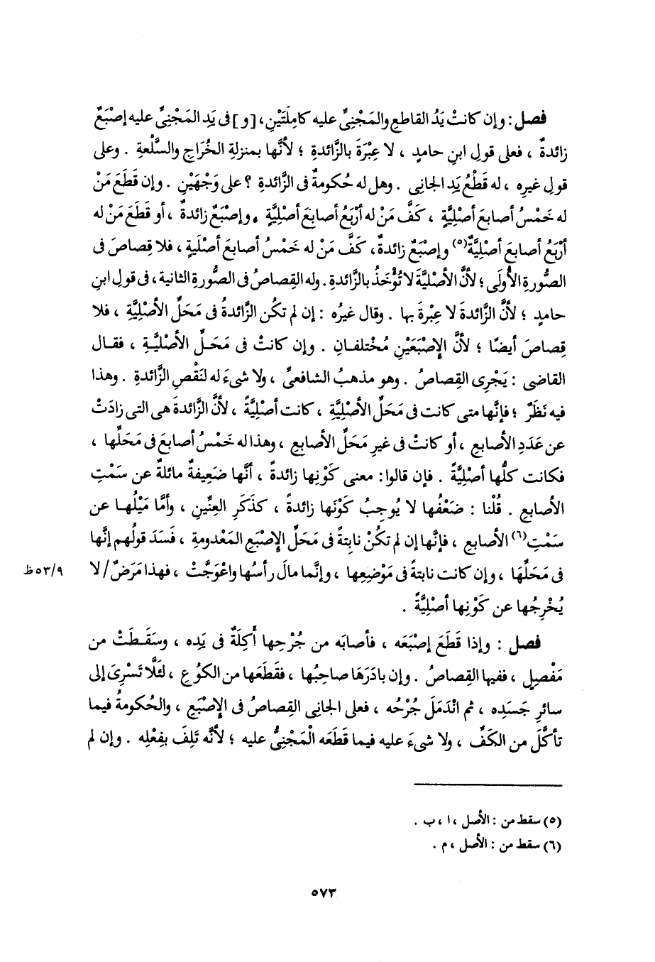 فصل: وإن كانتْ يَدُ القاطعِ والمَجْنِىِّ عليه كامِلَتَيْنِ، [و] في يَدِ المَجْنِىِّ عليه إصْبَعٌ زائدةٌ، فعلى قولِ ابنِ حامدٍ، لا عِبْرَةَ بالزَّائدةِ؛ لأنَّها بمنزلةِ الخُرَاجِ والسَّلْعةِ. وعلى قولِ غيرِه، له قَطْعُ يَدِ الجانِى. وهل له حُكومةٌ في الزَّائدةِ؟ على وَجْهَيْنِ. وإن قَطَعَ مَنْ له خَمْسُ أصابعَ أصْلِيَّةٍ، كَفَّ مَنْ له أرْبَعُ أصابِعَ أصْلِيَّةٍ، وإصْبَعٌ زائدةٌ، أو قَطَعَ مَنْ له أرْبَعُ أصابعَ أصْلِيَّةٌ (٥) وإصْبَعٌ زائدةٌ، كَفَّ مَنْ له خَمْسُ أصابعَ أصْلَيةٍ، فلا قِصاصَ في الصُّورةِ الأُولَى؛ لأنَّ الأصْليَّةَ لا تُؤْخَذُ بالزَّائدةِ. وله القِصاصُ في الصُّورةِ الثانية، في قولِ ابنِ حامدٍ؛ لأنَّ الزَّائدةَ لا عِبْرةَ بها. وقال غيرُه: إن لم تكُن الزَّائدةُ في مَحَلِّ الأصْلِيَّةِ، فلا قِصاصَ أيضًا؛ لأنَّ الإصْبَعَيْنِ مُخْتلفانِ. وإن كانتْ في مَحَلِّ الأصْليَّةِ، فقال القاضي: يَجْرِى القِصاصُ. وهو مذهبُ الشافعىِّ، ولا شىءَ له لنَقْصِ الزَّائدةِ. وهذا فيه نَظَرٌ؛ فإنَّها متى كانت في مَحَلِّ الأصْلِيَّةِ، كانت أصْلِيَّةً، لأنَّ الزَّائدةَ هي التي زادَتْ عن عَدَدِ الأصابعِ، أو كانتْ في غيرِ مَحَلِّ الأصابِعِ، وهذا له خَمْسُ أصابعَ في مَحَلِّها، فكانت كلُّها أصْلِيَّةً. فإن قالوا: معنى كَوْنِها زائدةً، أنَّها ضَعِيفةٌ مائلةٌ عن سَمْتِ الأصابعِ. قُلْنا: ضَعْفُها لا يُوجِبُ كَوْنَها زائدةً، كذَكَرِ العِنِّينِ، وأمَّا مَيْلُها عن سَمْتِ (٦) الأصابعِ، فإنَّها إن لم تكُنْ نابِتةً في مَحَلِّ الإِصْبَعِ المَعْدومةِ، فَسَدَ قولُهم إنَّها في مَحَلِّهَا، وإن كانت نابتةً في مَوْضِعِها، وإنَّما مالَ رأسُها واعْوَجَّتْ، فهذا مَرَضٌ لا يُخْرِجُها عن كَوْنِها أصْلِيَّةً.