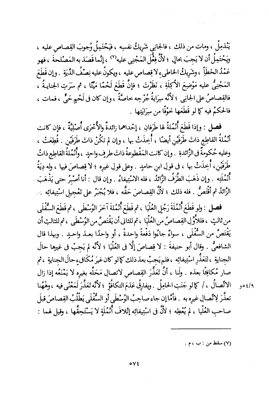 يَنْدَمِلْ، ومات من ذلك، فالجانِى شَرِيكُ نفسِه، فيَحْتَمِلُ وُجوبَ القِصاصِ عليه، ويَحْتَمِلُ أن لا يَجِبَ بحالٍ؛ لأنَّ فِعْلَ المَجْنِى عليه (٧)، إنَّما قَصَدَ به المَصْلحةَ، فهو عَمْدُ الخَطَإِ، وشَرِيكُ الخاطىءِ لا قِصاصِ عليه، ويكونُ عليه نِصْفُ الدِّيَةِ. وإن قَطَعَ المَجْنِىُّ عليه مَوْضِعَ الأكِلَةِ، نَظَرْتَ؛ فإن قَطَعَ لَحْمًا مَيِّتًا، ثم سَرَتِ الجنايةُ، فالقِصاصُ على الجانِى؛ لأنَّه سِرَايةُ جُرْحِه خاصَّةً، وإن كان في لَحْمٍ حَىٍّ، فمات، فالحكمُ فيه كما لو قَطَعَها خَوْفًا من سِرَايَتِها.