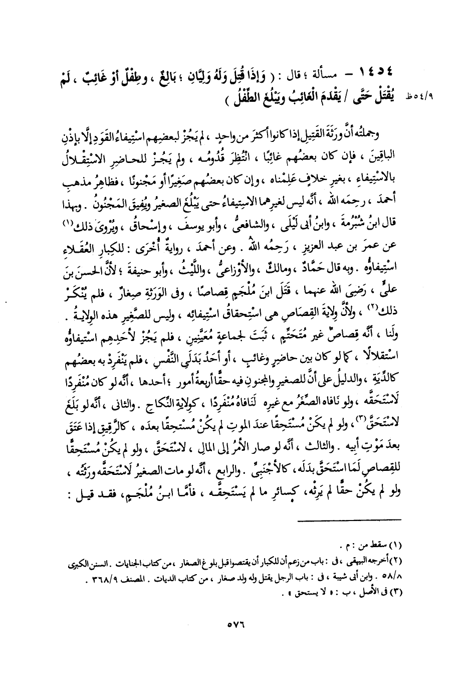 (٢) أخرجه البيهقي، في: باب من زعم أن للكبار أن يقتصوا قبل بلوغ الصغار، من كتاب الجنايات. السنن الكبرى ٨/ ٥٨. وابن أبي شيبة، في: باب الرجل يقتل وله ولد صغار، من كتاب الديات. المصنف ٩/ ٣٦٨.